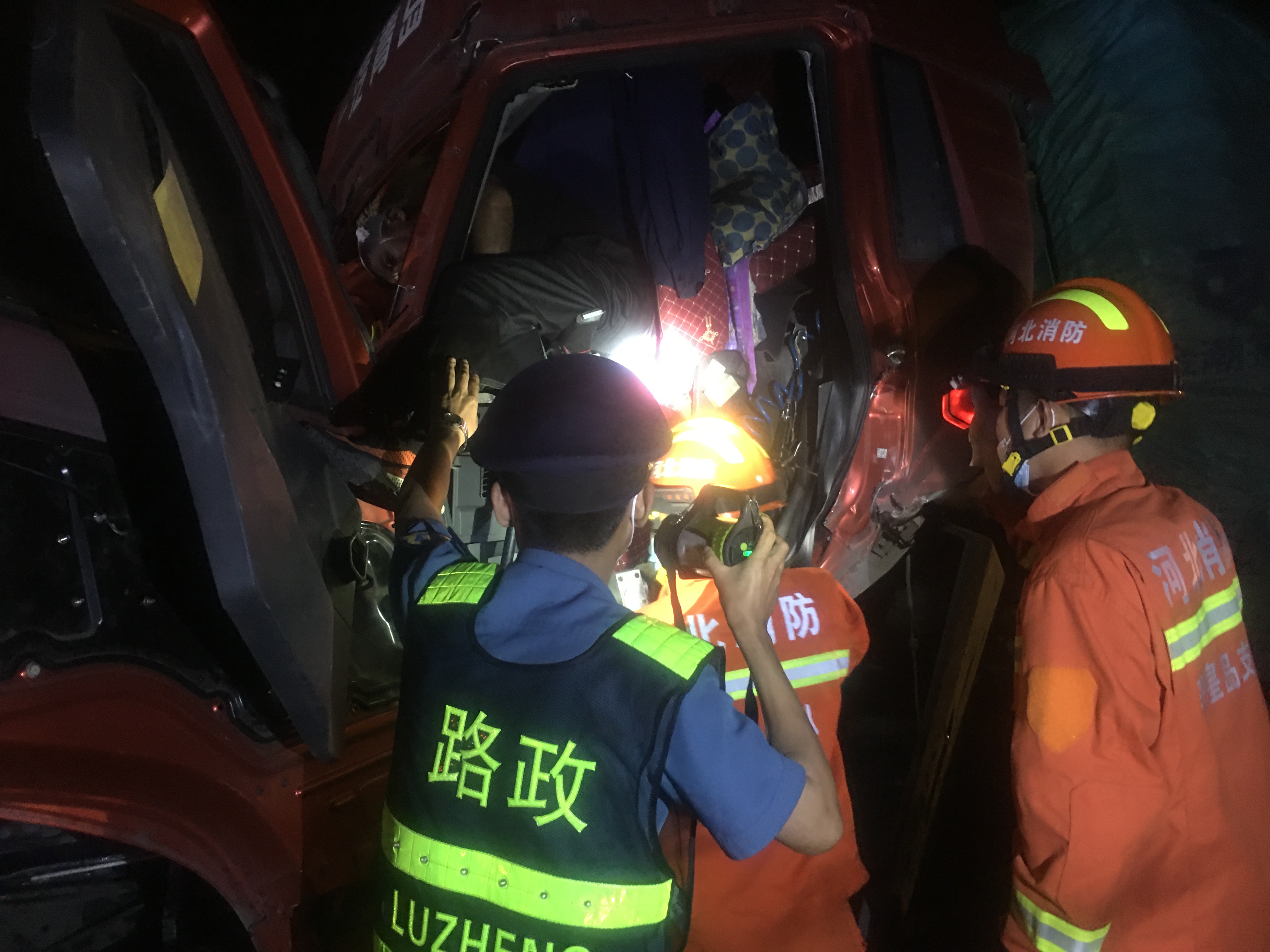 当天凌晨1时25分,乐亭大队接报警得知沿海高速天津方向k57+800处发生交通事故,执法人员郑一强、孙行于1时38分到达现场后发现有两辆大型半挂货车发生追尾事故,后车司机卡在车内,地面上散落着大量的玉米颗粒,由于当天正好是京哈高速分流沿海高速的第一天,车流量非常大,一有不慎即可能发生次生事故。执法人员见状,迅速摆放安全警示标志,疏导指挥车辆,一边通知消防人员、医疗部门和救援公司,同时对被卡车内人员进行安抚,稳定其情绪。1时53分,消防人员、急救人员和救援公司人员相继到达现场,执法人员配合消防人员对车辆进行破拆,将受伤人员转移到救护车上,随后协助救援人员清理路面粮食,拖曳事故车辆。2时15分事故清理完毕,道路恢复了正常通行。