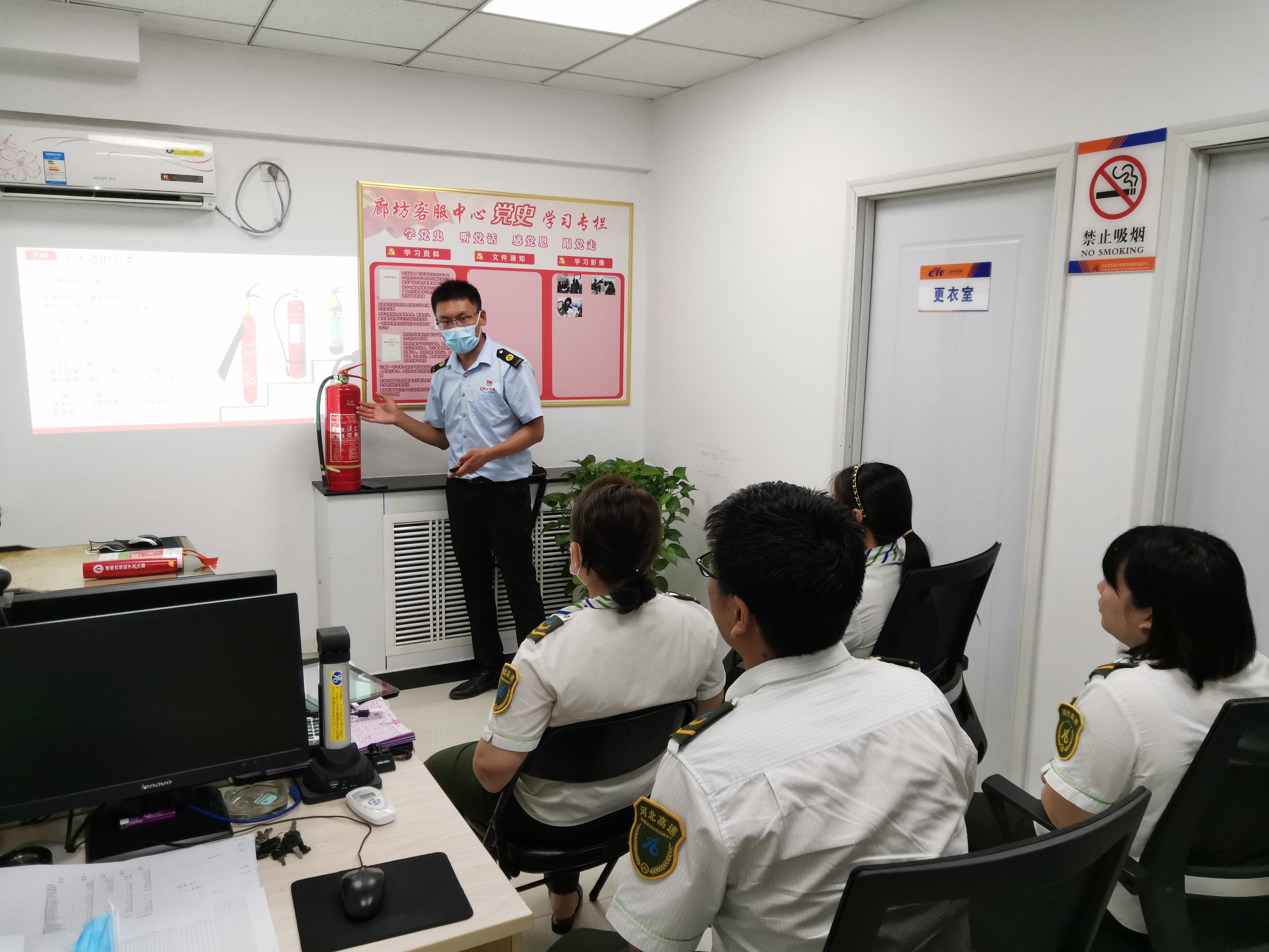 热烈庆祝建党100周年,为深入贯彻落实习近平总书记关于安全生产的重要论述,进一步提升客服中心消防安全管理水平,强化工作人员消防安全意识和自防自救能力,预防和减少火灾事故的发生,7月1日中午,ETC廊坊客服中心邀请消防培训赵老师为全体职工开展消防培训。