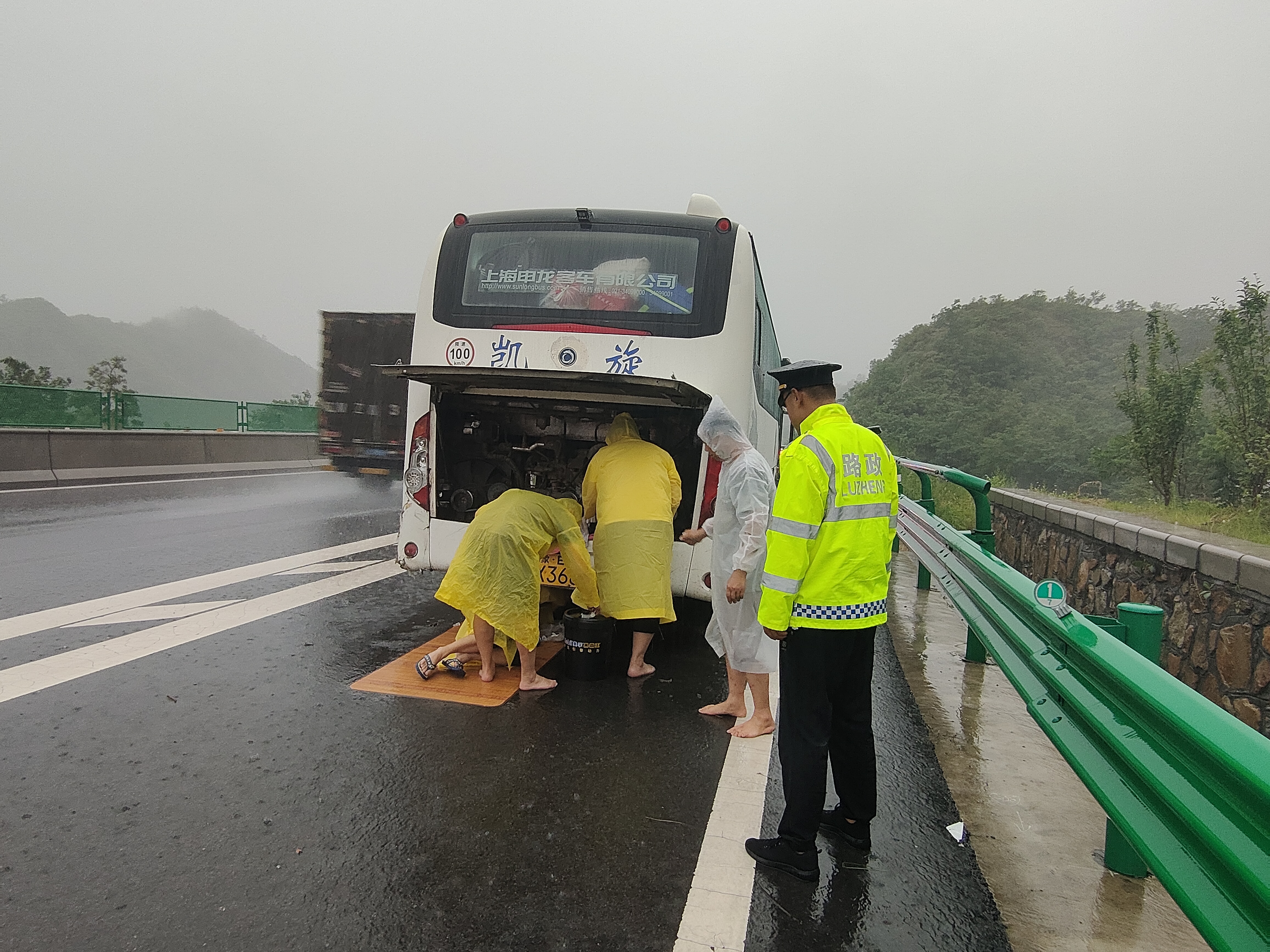 到达现场经了解得知,大巴车是从五台山返回河南的旅游大巴,上面载满乘客,车辆因发生故障,缺少机油,无法继续行驶,司机说加注机油后可以继续行驶。考虑到此时正值下午时分,车上人员众多,事发地点离县城较近,昨天市气象局又发布重要气象专报:11日傍晚至12日我市有暴雨到大暴雨,受低涡和副热带高压共同影响,我市将迎来今年入汛以来最强降水过程,另外上级单位对此次恶劣天气一再做出重要指示。我大队外业中队本着快清快撤、快速处理的原则,决定载着大巴司机去县城购买机油进行加注。当外业中队人员载着大巴司机买完机油返回途中,天空瞬间黑云密布,大雨顷刻而下。到达现场后,我中队人员在后边预警,司机加注机油,简单修理后,便恢复了正常。