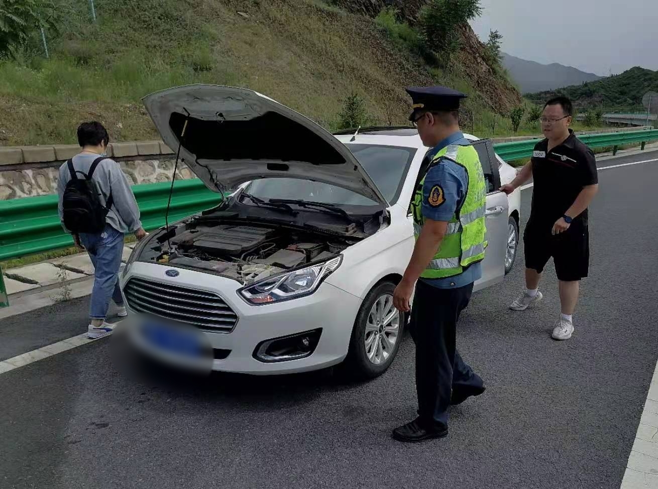 7月12日保沧支队城南庄大队外业执法人员巡查至西阜高速石家庄方向K5+600处,发现一辆白色轿车停在临时停车带内,车辆后方摆放着三角架警示牌。我中队外业执法人员立即下车,做好防护措施后,上前询问。经询问得知,车辆有一个故障灯亮起,且车速上不去60km/h。了解情况后,我中队一个人在车辆后方预警,一个人协助司机同志检查车辆。他们给车辆修理厂打电话进行咨询,十几分钟后便消除了车辆的安全隐患。和司机同志道别后,我中队继续向石家庄方向进行路政巡查。