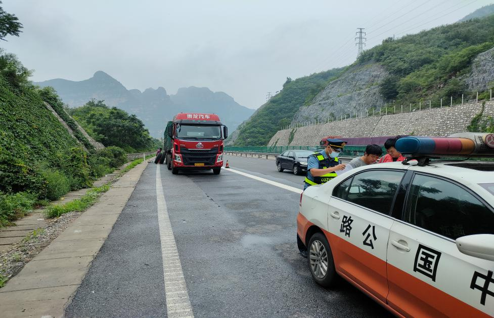 7月21日中午,天空下着小雨,廊涿支队涞水大队接到报警称,在张涿高速张家口方向K355处,有一辆货车停在应急车道需要救援,廊涿支队涞水大队路政人员立刻前往救援现场。
