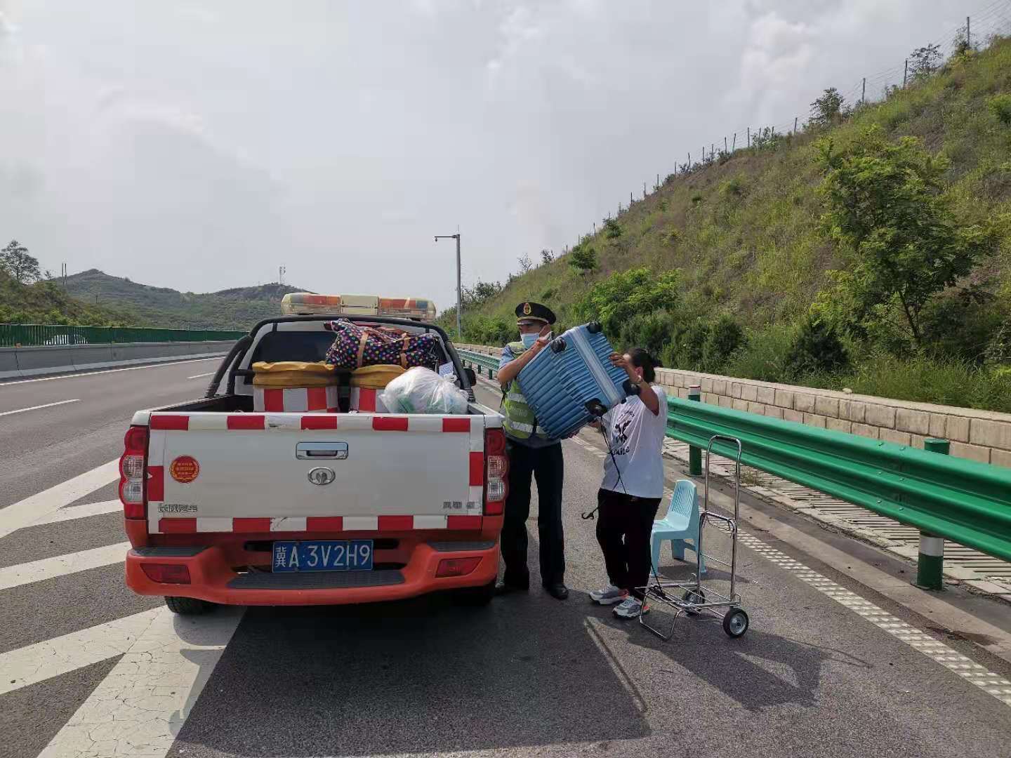 7月27日傍晚,在太行山高速公路涞源至曲阳段上发生了这样惊险的一幕。当时天空刚下过大雨,正在雨后巡查的路政执法人员发现一名妇女正在高速公路的应急车道上行走。因为时间是傍晚,司机的能见度将越来越低,她的处境十分危险。执法人员发现情况后,将巡逻车辆停在她后方并做好预警工作。