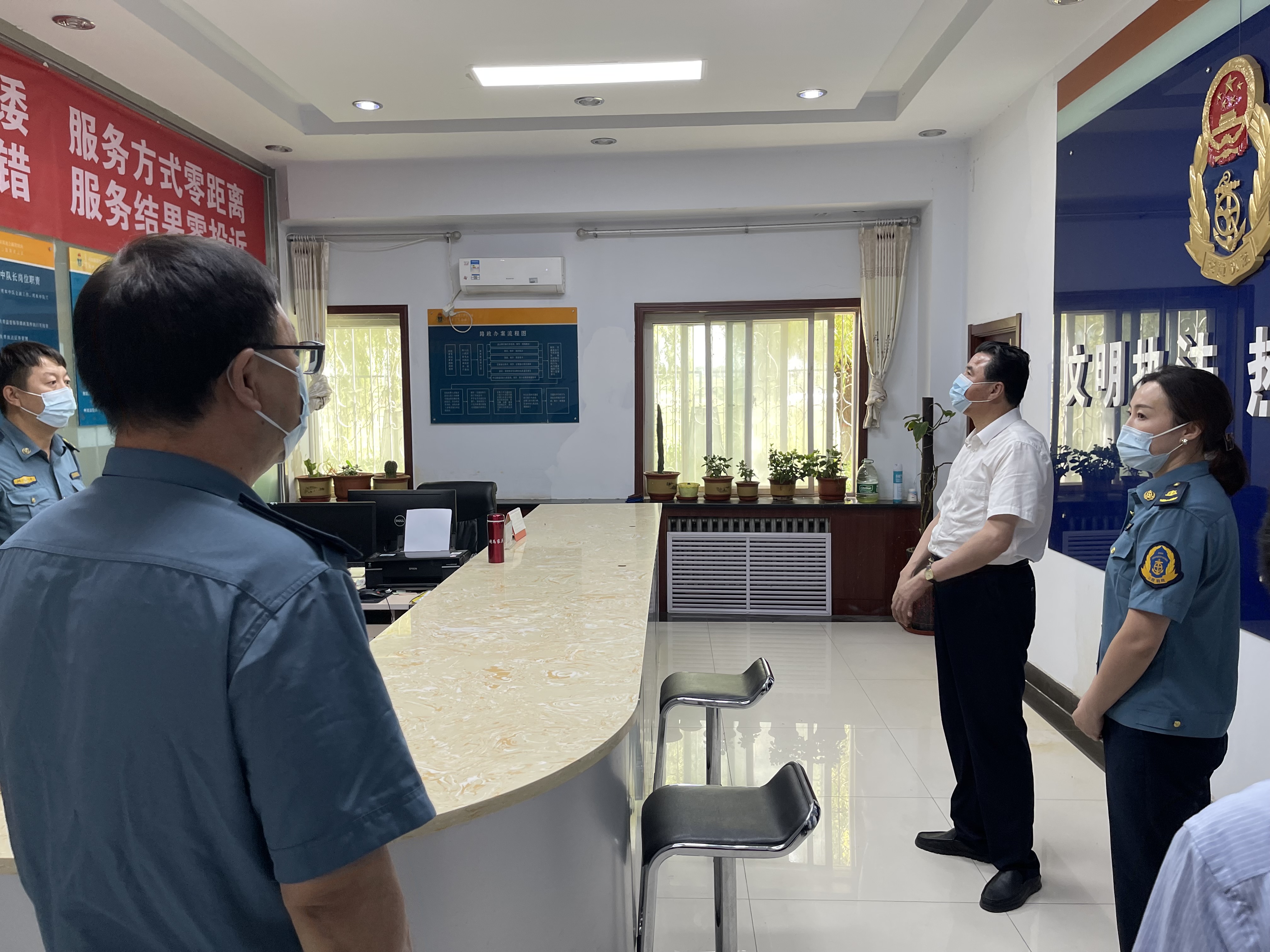 在宣化路政大队督导时由讲解员对单位基本情况、信息化装备、疫情防控进行详细介绍。随后,督导组成员对大队疫情防控工作“八方面”内容进行了认真细致的检查,并对单位疫情防控工作开展情况表示了充分的肯定。