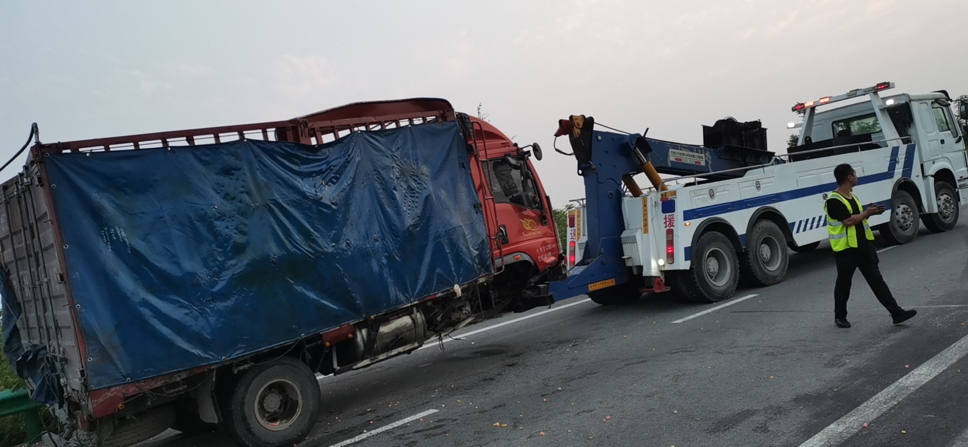 为防止二次事故的发生,外业中队立即启动突发事件应急预案,协助高速交警封闭匝道,摆放安全锥筒和警示标志,在做好现场防护工作的同时安排巡逻车在后方预警。随后执法人员协助高速交警清理出应急车道,让车辆缓慢通行,指挥交通,疏导车辆。同时联系救援公司进行清障施救。随后,执法人员配合救援公司对事故车辆进行了拖移,对路面进行了清理。经过多方的共同努力,5时50分,事故现场处置完毕,道路恢复正常通行。