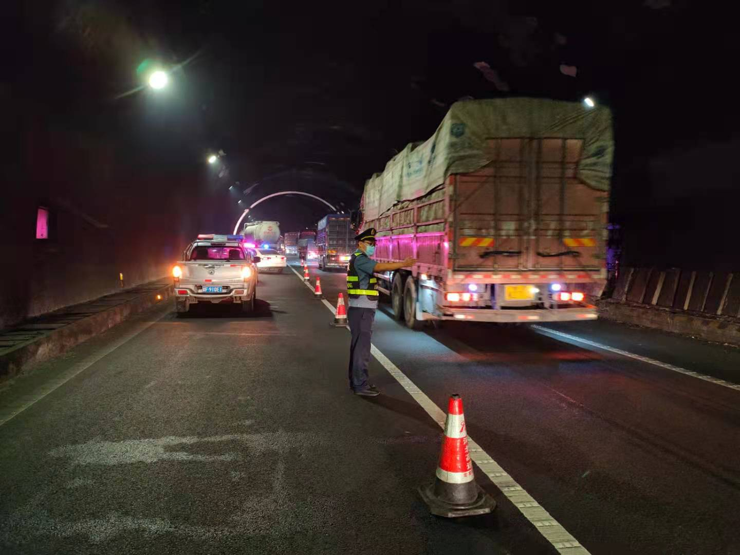 22时3分,路政涞水大队外业执法人员接值班电话报知张涿高速涿州方向K340处一辆货车发生交通事故,执法人员迅速反应,穿戴装备赶赴现场。22时25分,路政执法人员与交警人员几乎同时抵达,于南峪隧道内发现了事故车辆,车辆停在左侧车道内。路政执法人员与交警相互配合,一方面摆放反光锥桶设置安全措施,一方面对隧道内车辆进行紧急疏导,确保隧道内其余车辆安全有序通行。不多时,救援单位赶到,对事故货车进行救援,并将现场清扫干净。22时48分,事故现场处理完毕,张涿高速南峪隧道已恢复通行。