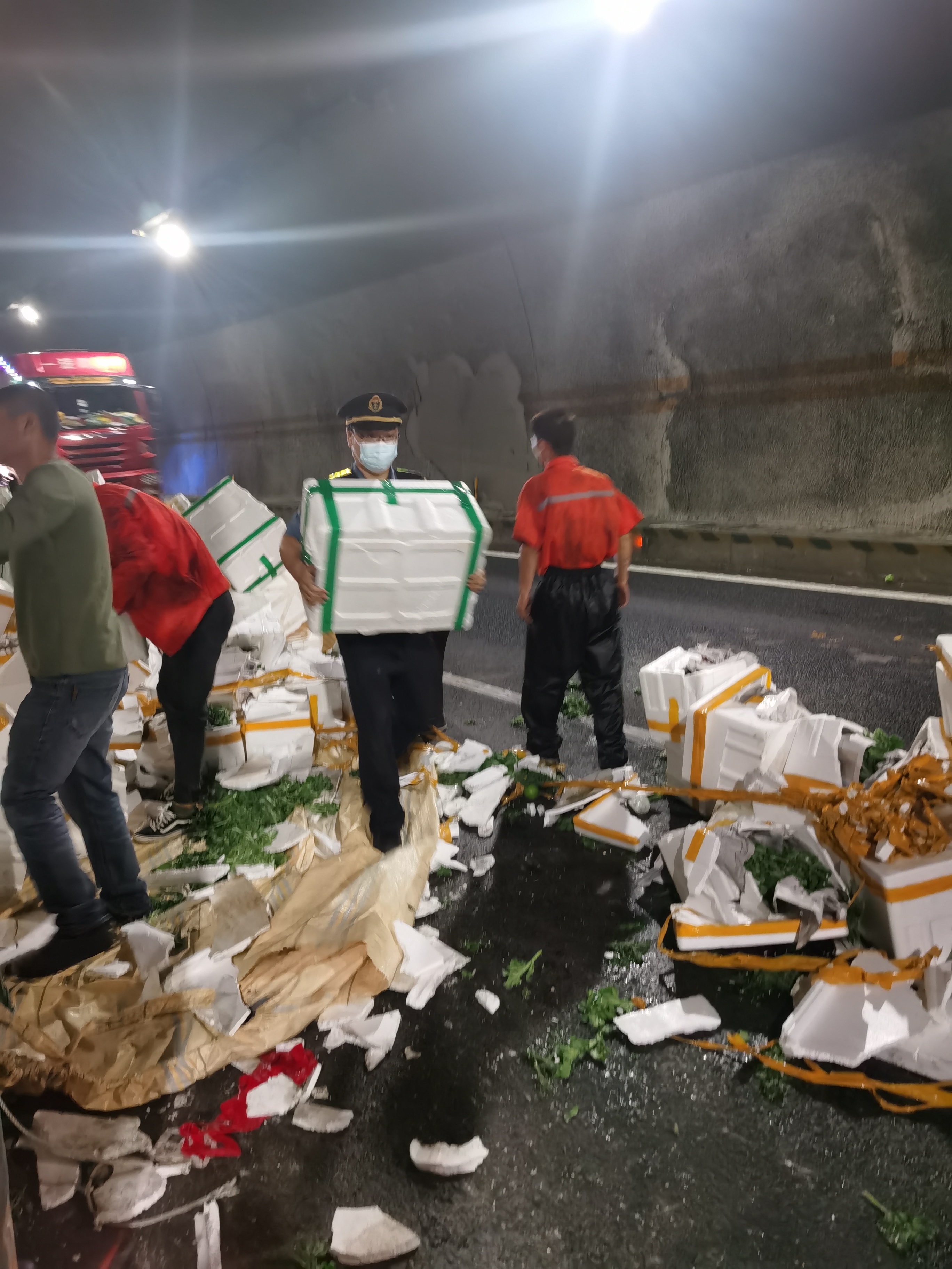 6时20分,接到交警报警电话通知张涿高速公路涿州方向都衙隧道K345+450处一辆货车侧翻,外业执法人员立即赶往现场,6时35分赶到现场后发现货车侧翻在应急车道内,货物撒落到行车道和超车道边缘。一名执法人员立刻协助交警在事故现场后方摆放反光锥预警,另一名执法人员快速将撒落到超车道边缘货物搬走,保证超车道畅通,避免二次事故发生。等救援公司到达现场后,执法人员协同救援人员以最快的速度将货车上的货物搬至倒货车,7时46分倒货完成,仅仅用时1小时。执法人员协助交警在事故现场后方进行预警,为救援侧翻货车时交通管制做好预警工作。同时要求救援公司尽快对货车进行清撤,尽量减少封路时间。8时19分货车被拖走,事故现场清理完毕,道路恢复正常通行。