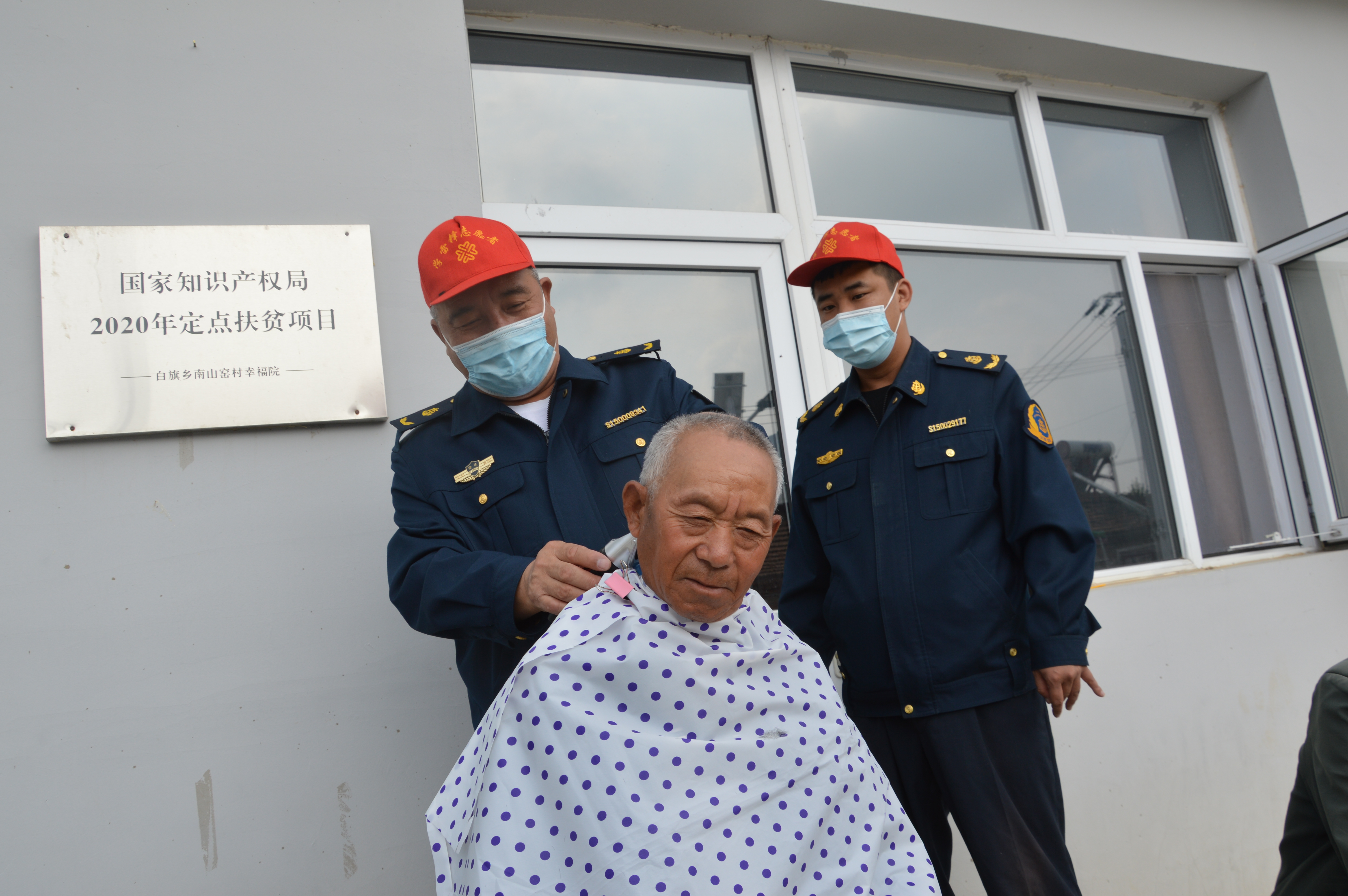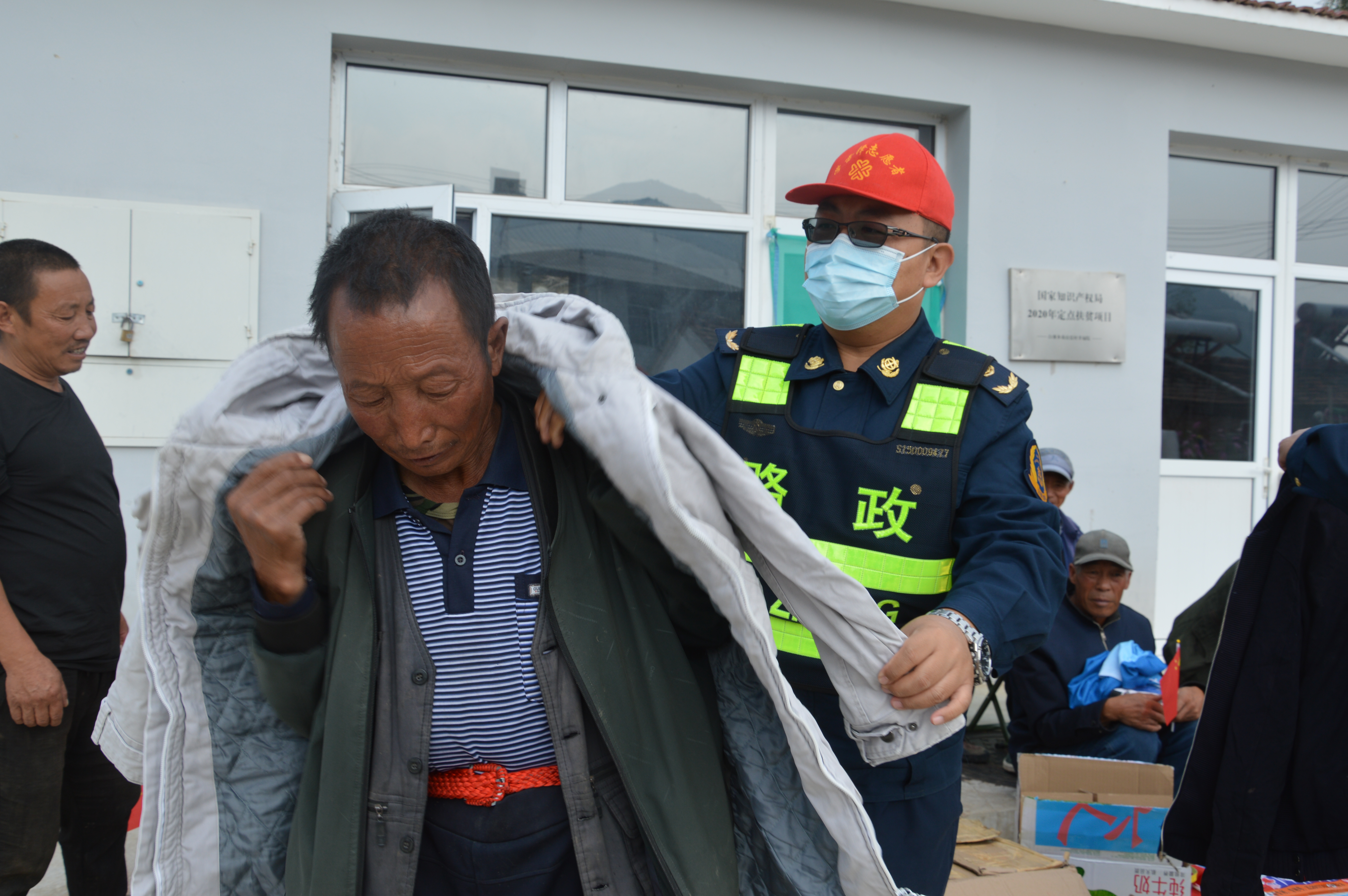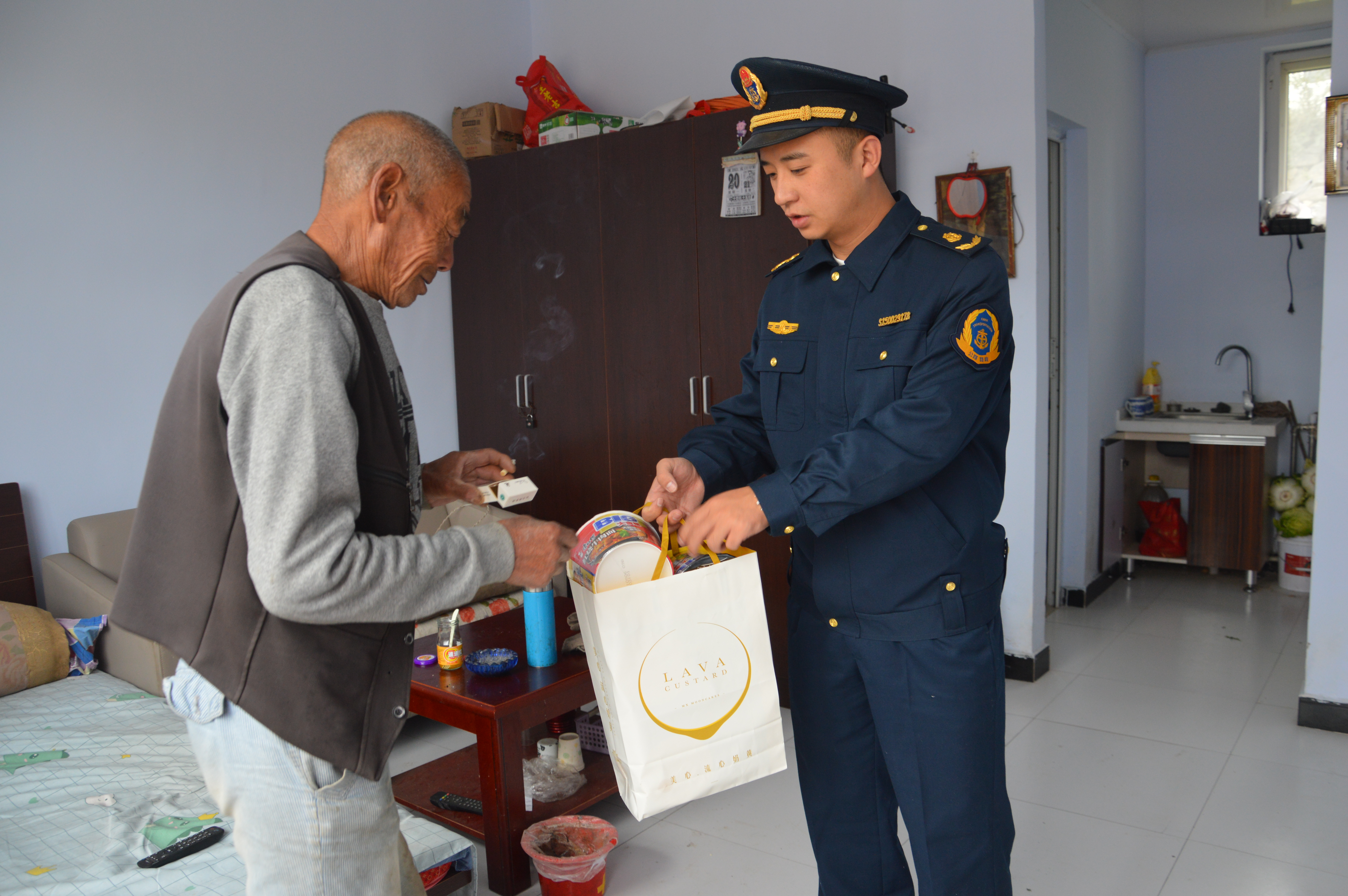 路政志愿者身穿蓝色制服头戴小红帽与老人相聚在幸福院,他们分工有序,配合默契,有的分发慰问品、有的试试合身的衣服满院其乐融融。
