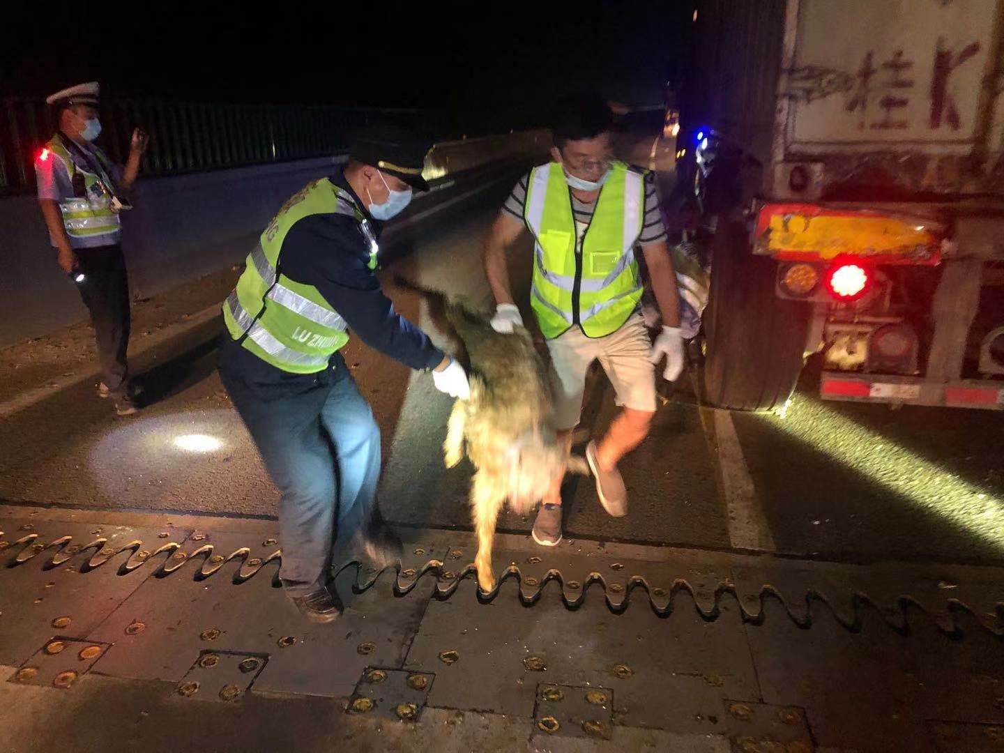 后面突发情况一拉牛的货车,两头大奶牛跑了出来,司机跑过来向执法人员寻求帮助,执法人员立即跑过去帮忙,可是由于奶牛的体型巨大,为逮捕工作带来了难度,执法人员与牛开始了“斗志斗勇”你追我赶,在经过一个小时努力下终于成功控制住了牛。