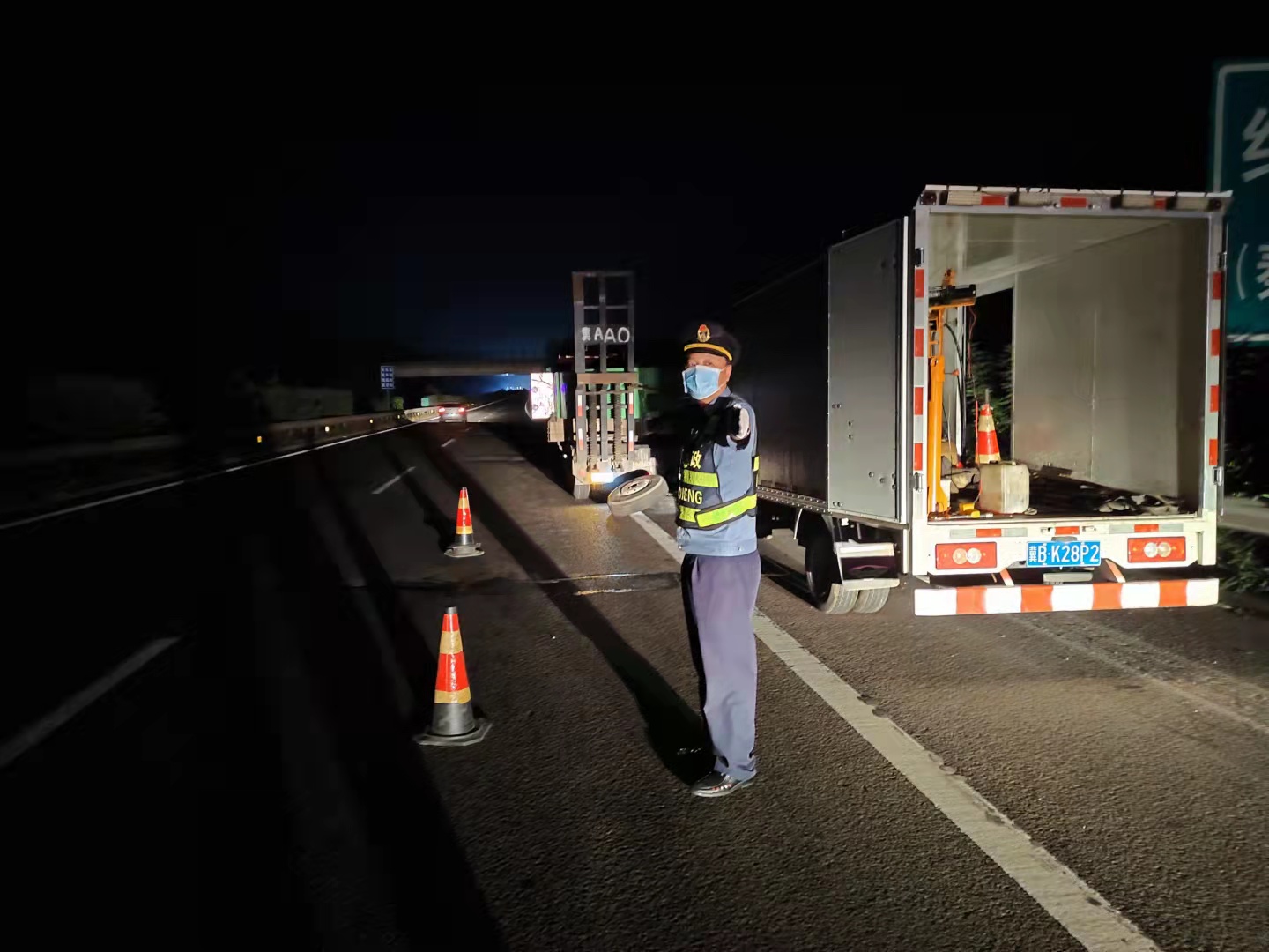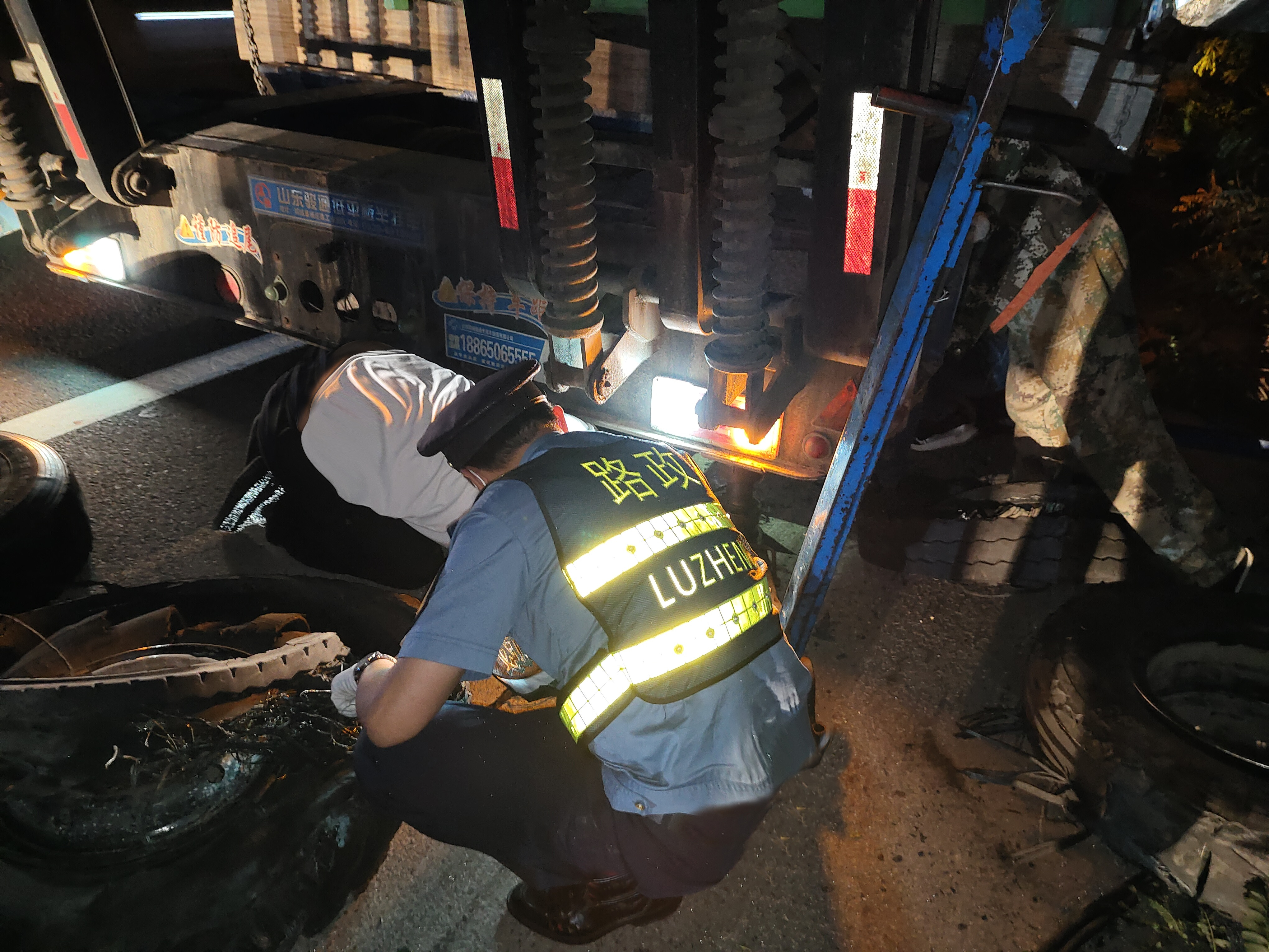 当日18时25分,乐亭大队执法人员接到报警电话称,在沿海高速秦皇岛方向距乐亭服务区还有两公里左右的地方,有一辆大货车突发爆胎事故,请求救援。随后,执法人员一边赶赴事故现场,一边联系了救援人员。18时57分到达现场后,执法人员发现一辆满载的大型半挂牵引货车正停在应急车道上,车辆爆胎无法正常行驶。此时正值傍晚,天色逐渐变黑,行车视线逐渐变差,如不及时处置极有可能造成刮擦、追尾等事故。见此情况,乐亭大队执法人员立即分组开展行动,一组人员在车辆后方150米处摆放安全警示标志并指挥疏导后方来车;另一组协助专业救援队帮助故障车辆及时更换轮胎。