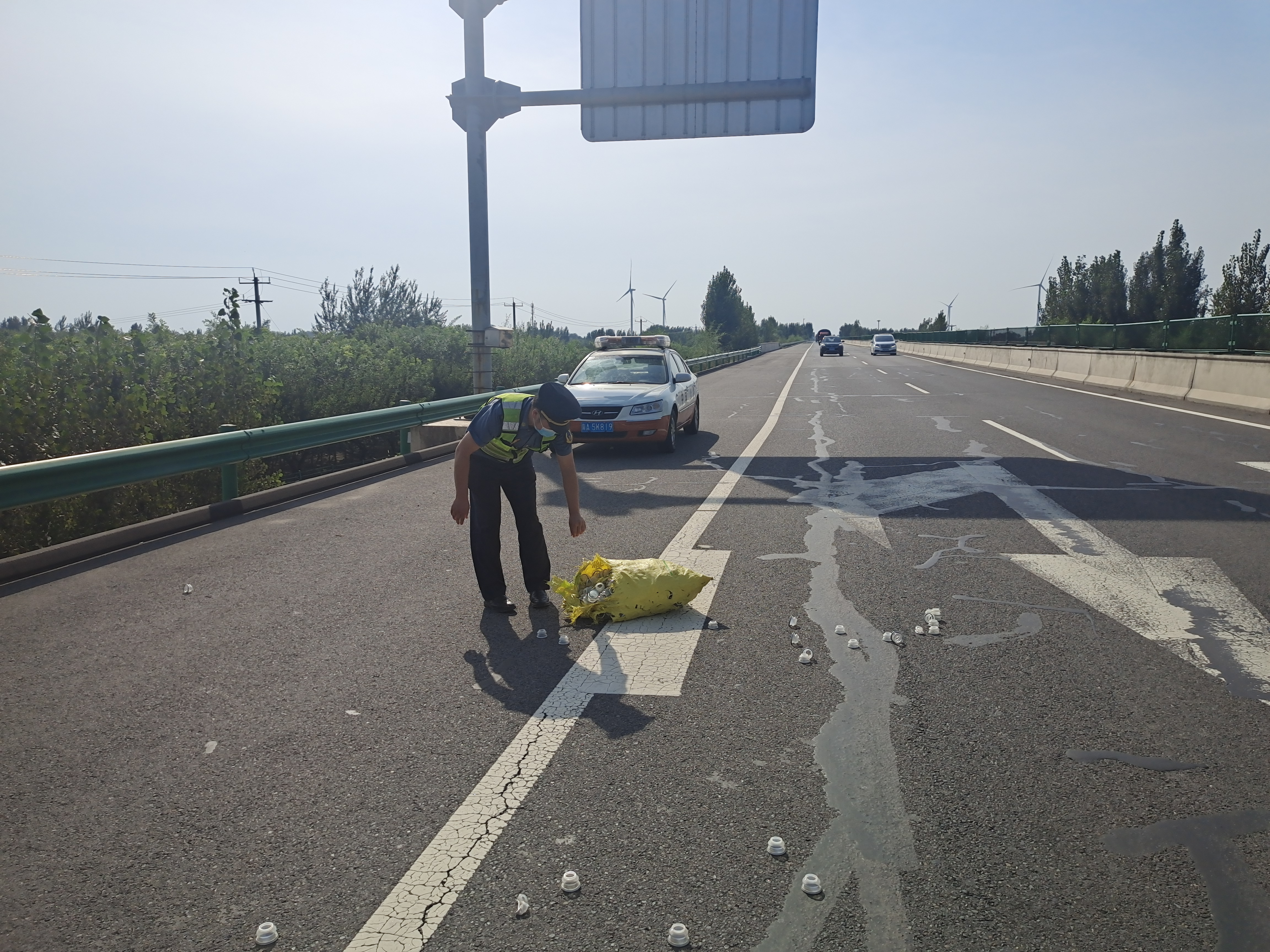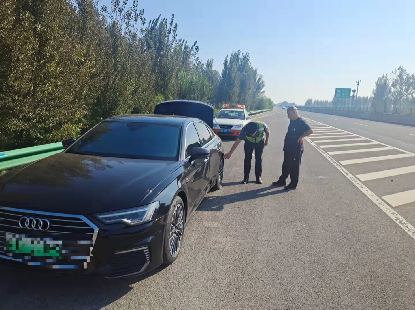 9月22日上午9时,当中队长张志刚、刘杰巡查至邢台方向K64+400公里处时,发现一辆轿车停在应急车道。执法人员迅速上前询问情况,司机说轿车不知什么原因出现了故障,自己正一筹莫展。张志刚、刘杰主动上前帮助司机检查车辆,经检查发现原来是车胎没气,但由于车主未携带打气泵或备胎,刘杰立即联系救援公司前来施救。