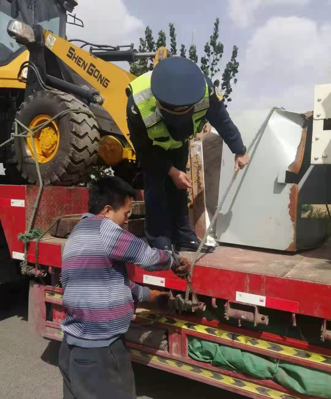 决战决胜文明服务——近日,外业一中队张长征、刘宏图日常巡查时,发现一辆运输机械设备的货车固定绳松散导致车辆货物倾斜,他们立即告知车主情况,并主动上前帮助车主将货物重新捆绑固定。同时温馨提醒车主发车前一定要严格检查车辆的安全性能及货物捆绑的牢固程度,避免因货物捆绑不牢,可能在运输途中掉落,给自己和后方车辆带来伤害。执法人员用自己的贴心服务让过往司乘更有获得感、幸福感和安全感,更乐意选择高速公路出行。