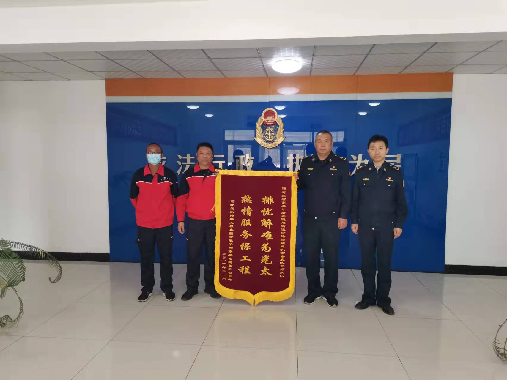 在三河大队路政执法人员热心帮助和悉心指导下,河北光太路桥工程集团有限公司顺利安全地完成了此次罩面施工,对此不胜感激,送锦旗以示谢意。一面锦旗不仅代表着企业对路政执法人员的感谢,也是对路政管理工作的肯定。三河大队大队长李志刚表示,将秉承“文明执法、热情服务”的工作理念,坚持内强素质,外树形象,努力把路政管理工作做细做实,更好地服务辖区企业和过往司乘人员。