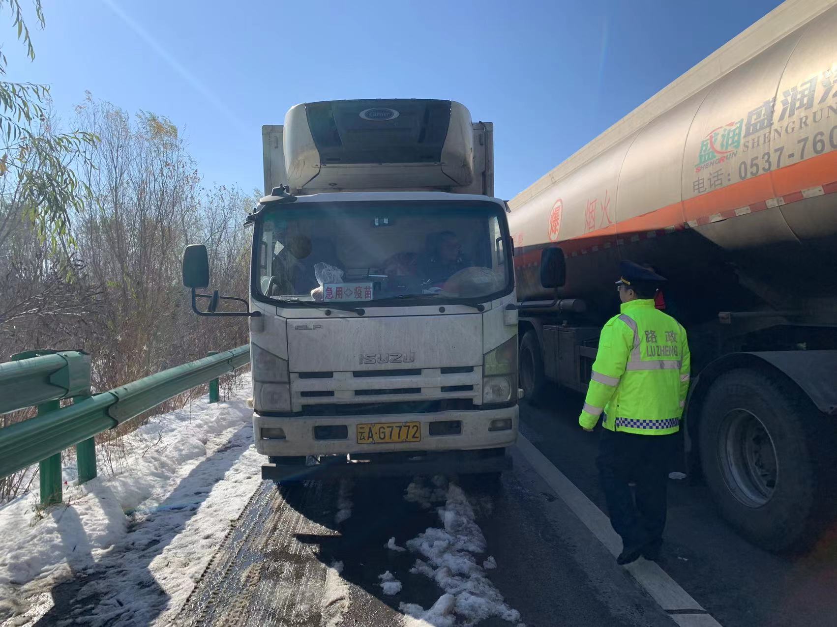 沿海支队昌黎大队立即联系车辆驾驶人,询问具体情况。得知因京沈高速沈阳方向下雪封闭,疫苗运输车辆堵到沿海高速秦皇岛方向秦皇岛西收费站附近,因疫苗需要冷藏,不能熄火停车,车辆所携带油量不足,需要紧急就近加油,确保新冠病毒疫苗完好。