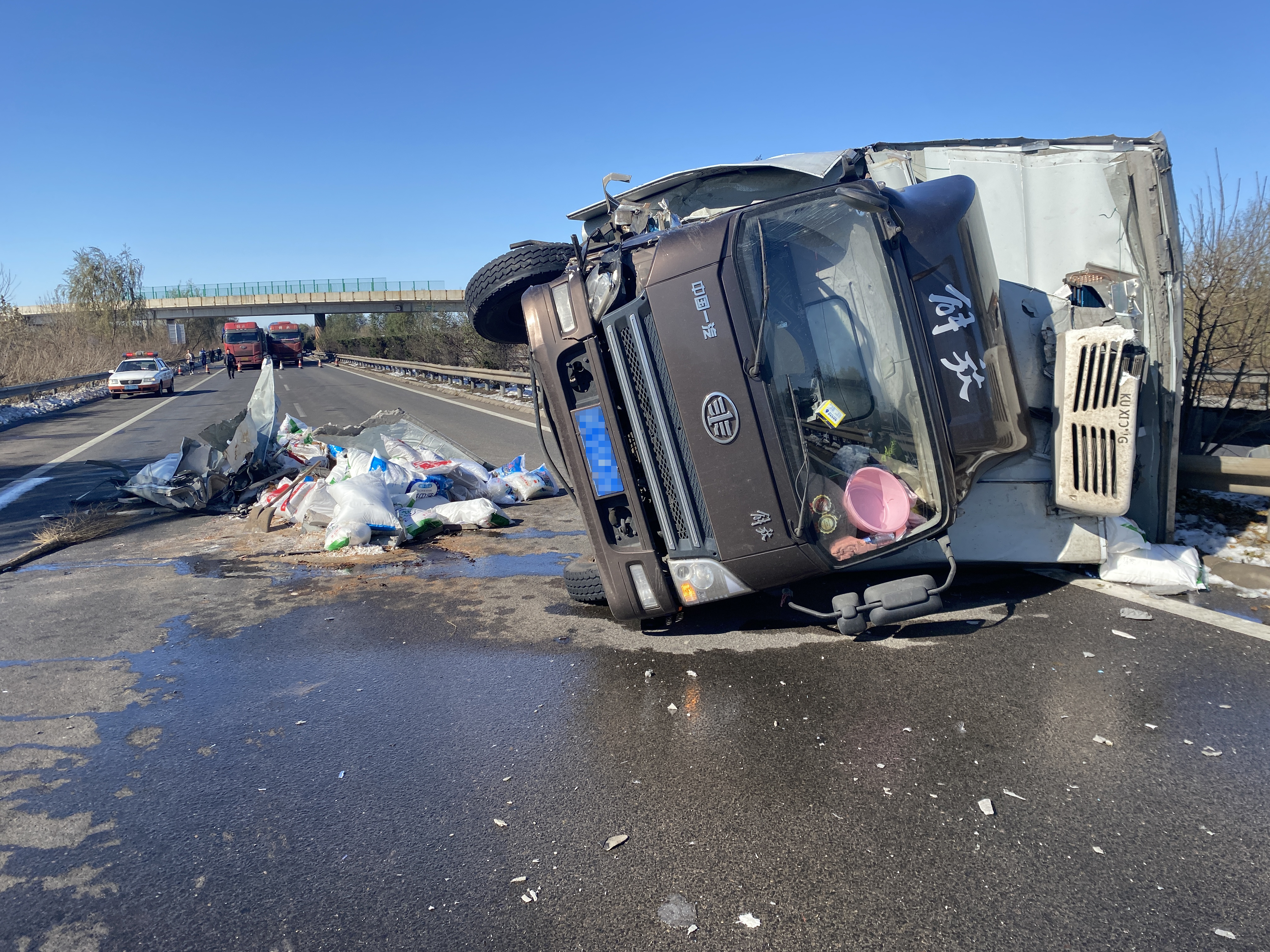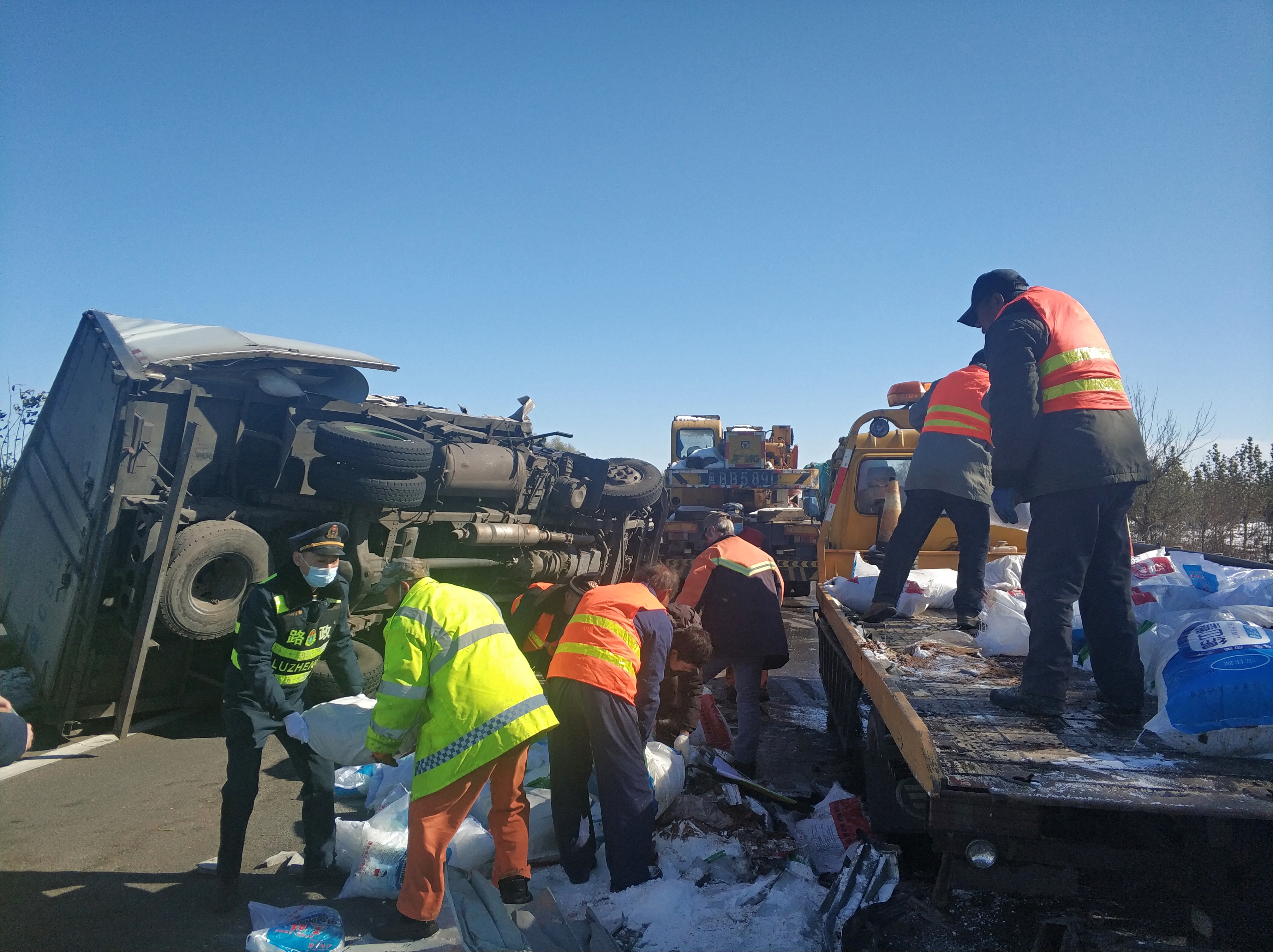 当天上午11时03分乐亭大队内业值班室接报警电话称,辖区秦皇岛方向K98+510处一厢货与半挂发生剐蹭事故,导致厢货侧翻,接警后正在巡查途中的外业队员立即驱车赶赴事故现场,抵达现场后发现厢式货车侧翻在超车道上,车上所拉的袋装冰糖、红砂糖、白砂糖散落一地,所幸货车司机只是受到点轻伤并无大碍。为了最大限度的减少经济损失,外业执法人员随即为当事人联系了辖区救援公司,待救援公司到达后,执法人员一边协助高速交警在事故后方进行预警管控,一边帮助救援人员对散落在地上的袋装糖搬运到救援拖车上,最终经过路政、交警、救援人员的共同努力,散落在地上的货物被全部清理,侧翻在路上的事故货车也被安全拖离,道路再次恢复正常通行。临别前事故当事人热泪盈眶,对路政执法人员不畏严寒为百姓办实事的仁心善举赞不绝口,并从兜里掏出钱来欲表感谢被执法人员婉言谢绝。