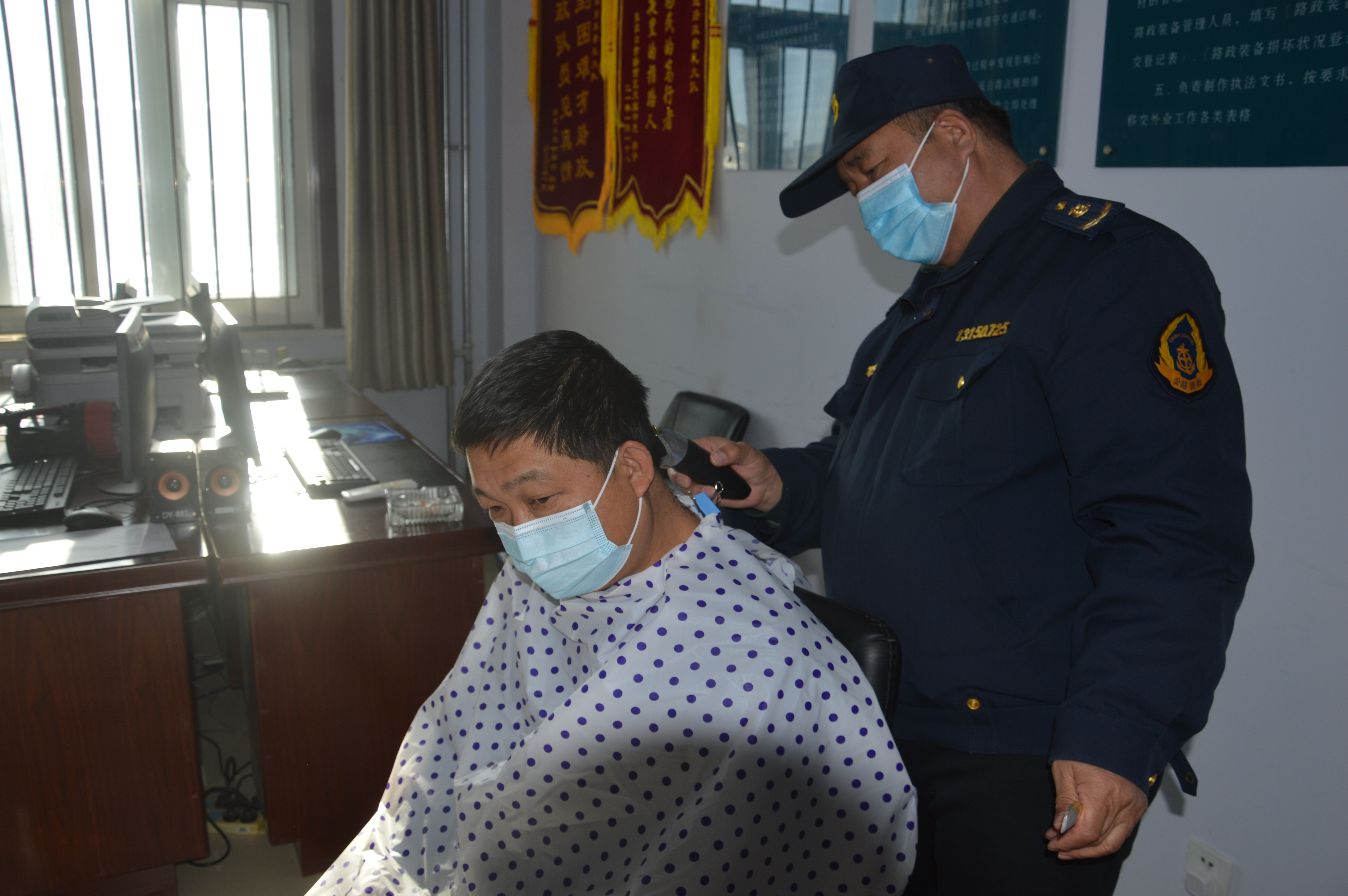然而在这个疫情防控的特殊时期,一个问题难倒了大队执勤的路政队员们,一个月的高速坚守,队员们头发都开始野蛮生长,原本帅气的路政小哥哥们眼看着就要迈入邋遢大叔的行列,这既影响了大家的心情,又不利于展示高速路政良好的外在形象,再加上身处张家口疫情防控特殊时期和北京冬奥会崇礼赛区期间严格管控不能到市区去理发的原因,经过大家一番考量下,大队里动手能力强的郭进军摇身一变便化身理发师支起了他的小摊。