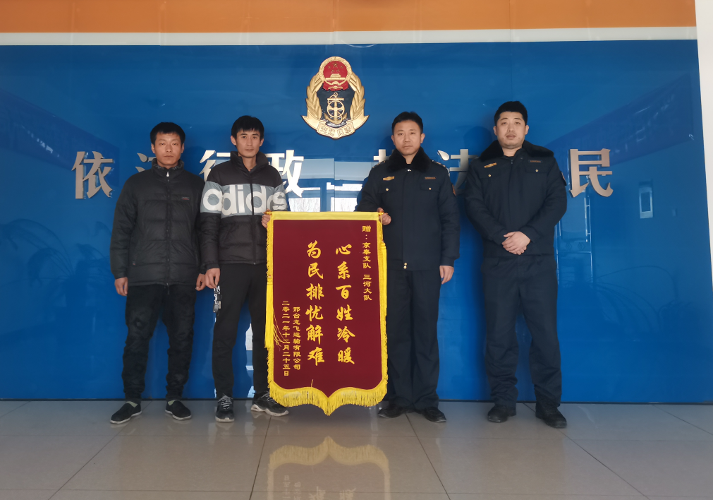 12月25日,邢台龙飞运输有限公司将写有“心系百姓冷暖,为民排忧解难”的锦旗送到京秦支队三河大队,向路政执法人员表达感谢,称赞三河大队路政执法人员心系人民,热情执法。