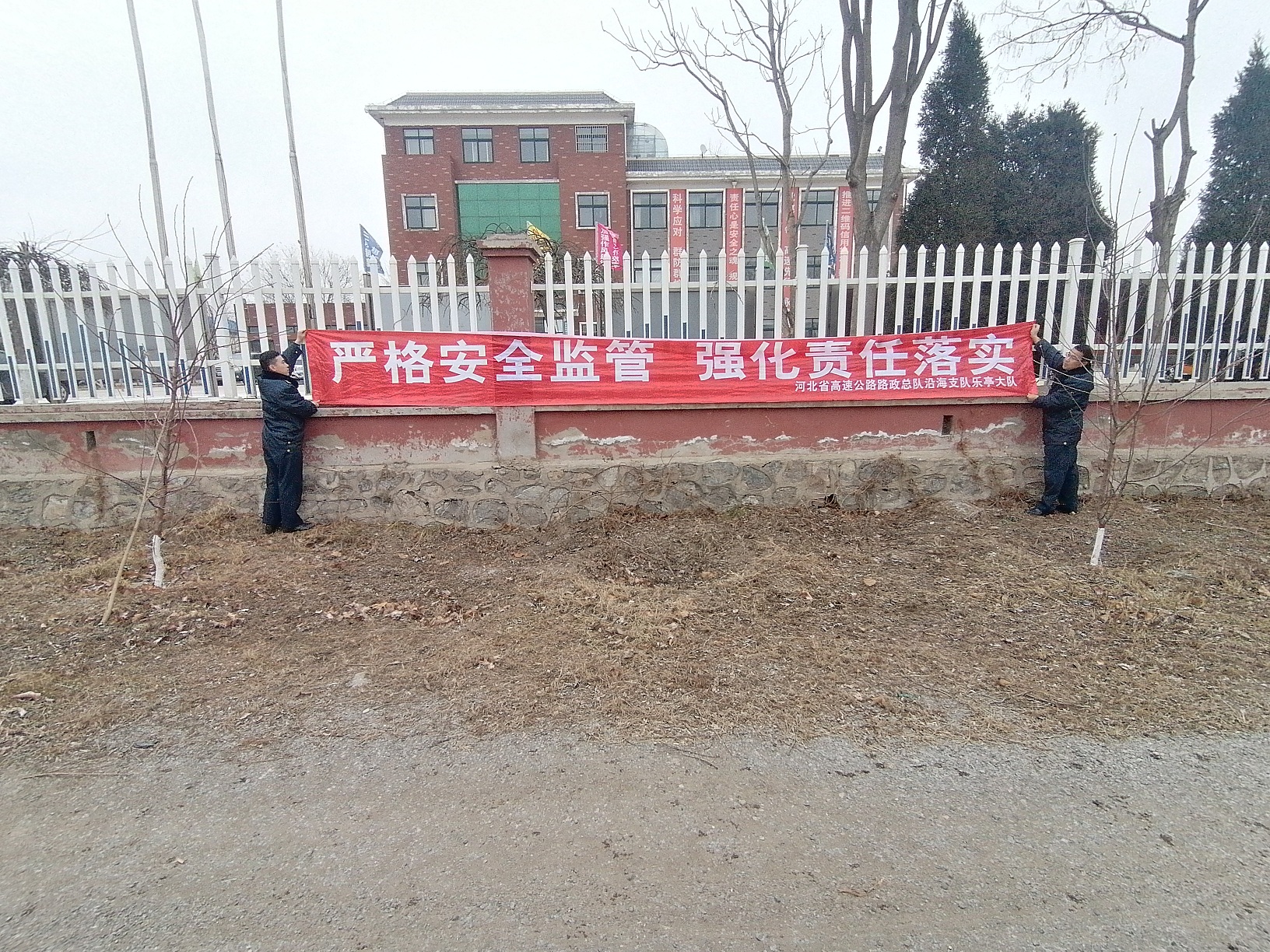 三是悬挂条幅。1月9日在乐亭东收费站、昌黎服务区和大队驻地等地点的显著位置处,分别悬挂了以“安全生产人人重视、安全职责人人遵守;生命重于泰山、安全牢记心中”等条幅,营造出了良好的舆论氛围。