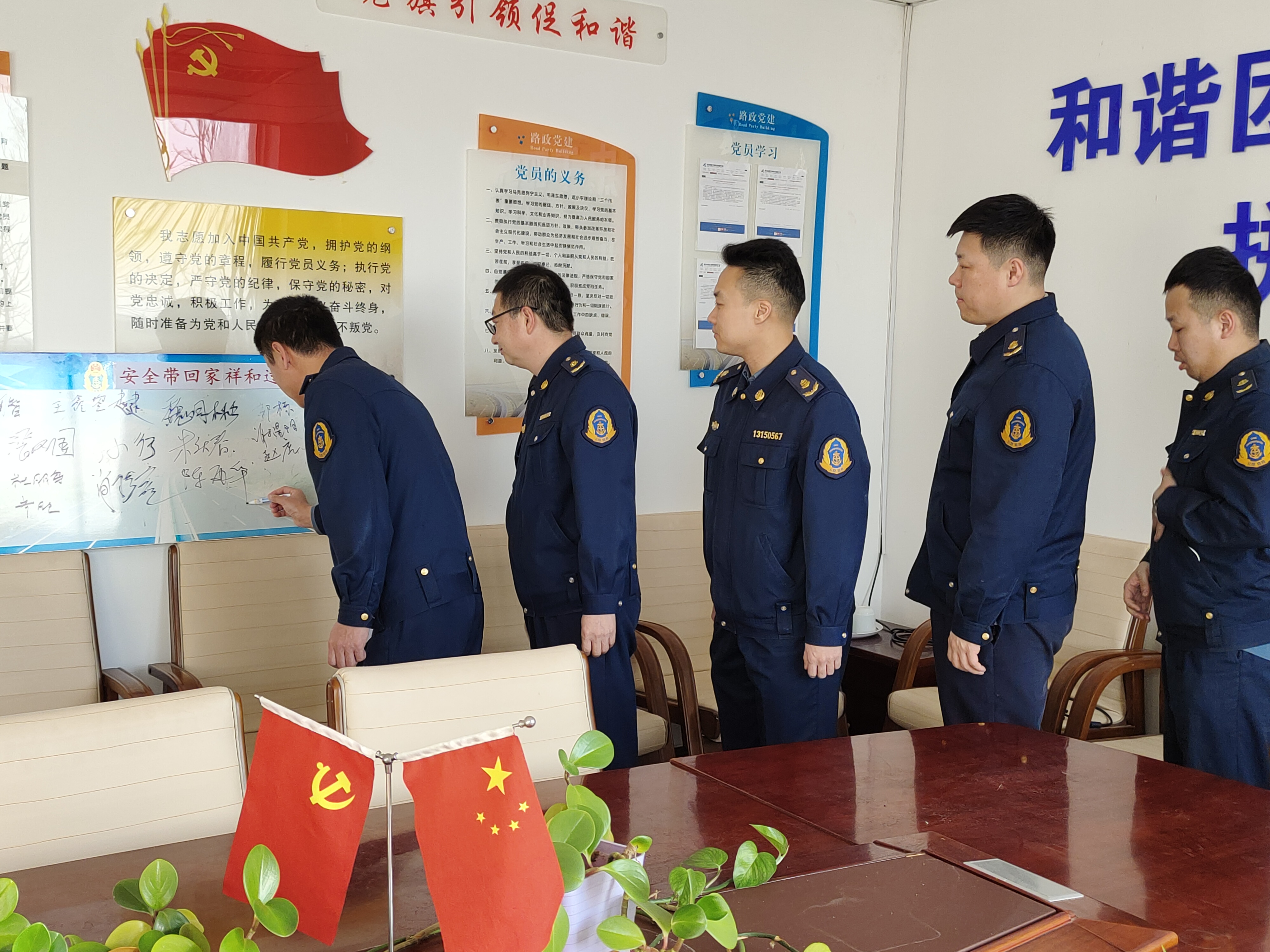 一是出台方案:大队在1月18日,制定出台了具有操作性强而又符合大队工作实际的2022年安全带回家 祥和过大年主题志愿服务活动的实施方案,将活动的目的、意义、时间、措施、形式和要求等事项进行了明确的规定。 二是成立组织:大队成立了以大队长为班长、副大队长为副班长、中队长为班员的志愿服务活动专班,明确了成员的职责、任务和目标,做到了分工明确,责任到人。三是签名承诺:大队专项制作了安全带回家 祥和过大年主题教育活动的签名板,每名职工均在签名板上严肃而庄重的签下了自己的名字,从而增强了落实活动的责任心和紧迫感。四是建立队伍:大队成立了以党员为主体的志愿服务宣传队、以外业中队人员为主的志愿服务队、以内业和办公室人员为主题的志愿服务先锋岗,做到宣传、咨询、服务、落实四到位,确保志愿服务活动有声有色。