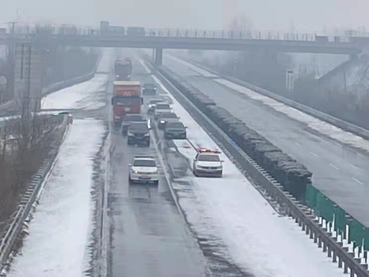 面对恶劣天气,乐亭大队以雪为令,迅速启动应急预案,通过加大巡查力度、发布路况信息、提醒养护工区尽快撒盐除雪等措施,确保辖区道路安全畅通。凌晨2时,雪量逐渐增大,道路出现结冰,随即全线封闭。为了保证路上行驶的车辆安全通行,防止发生拥堵情况,降低交通事故的发生几率,乐亭大队及时与高速交警机场大队和曹妃甸大队进行沟通协调,根据联勤联动的保畅机制和职责分工,迅速采取了“路警压车带道、通行车辆跟随、救援车辆预警”的措施,统一行动、集中实施,以每小时40公里的速度,历经两个小时将主线上双向所有的车辆带出大队管辖区域。