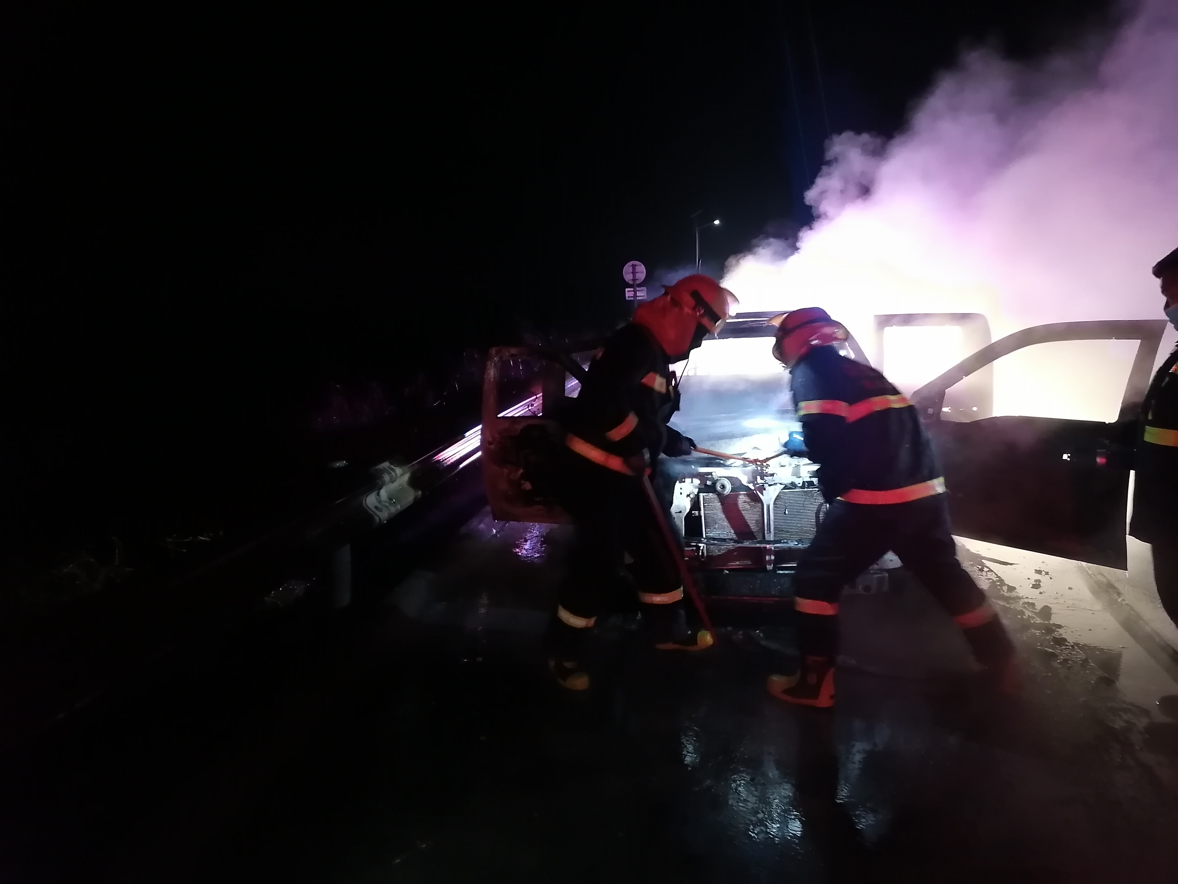 2月7日20时5分,乐亭大队接报警得知,沿海高速秦皇岛方向k97+880处发生车辆自燃事故,执法人员郭伟、郜伟在20时18分到达现场后发现,一辆中型皮卡车发生了自燃,停在应急车道内,由于恰逢春运高峰期,当时的车流量很大,一有不慎极有可能发生次生事故。执法人员迅速摆放安全警示标志,询问当事人无人员伤亡,车辆使用的是柴油,且油箱内燃油基本用尽,排除发生爆炸的可能性后,同时及时通知了消防人员和救援公司。在20时29分,消防车辆和救援人员相继到达现场后,执法人员积极配合消防人员对自燃车辆进行喷水灭火,3分钟后大火被扑灭,20时37分,车辆被牵引和拖曳完毕,道路恢复了正常通行。由于当时天色已晚且天气寒冷,执法人员根据当事人的请求,将其送到了就近的乐亭服务区进行休息。