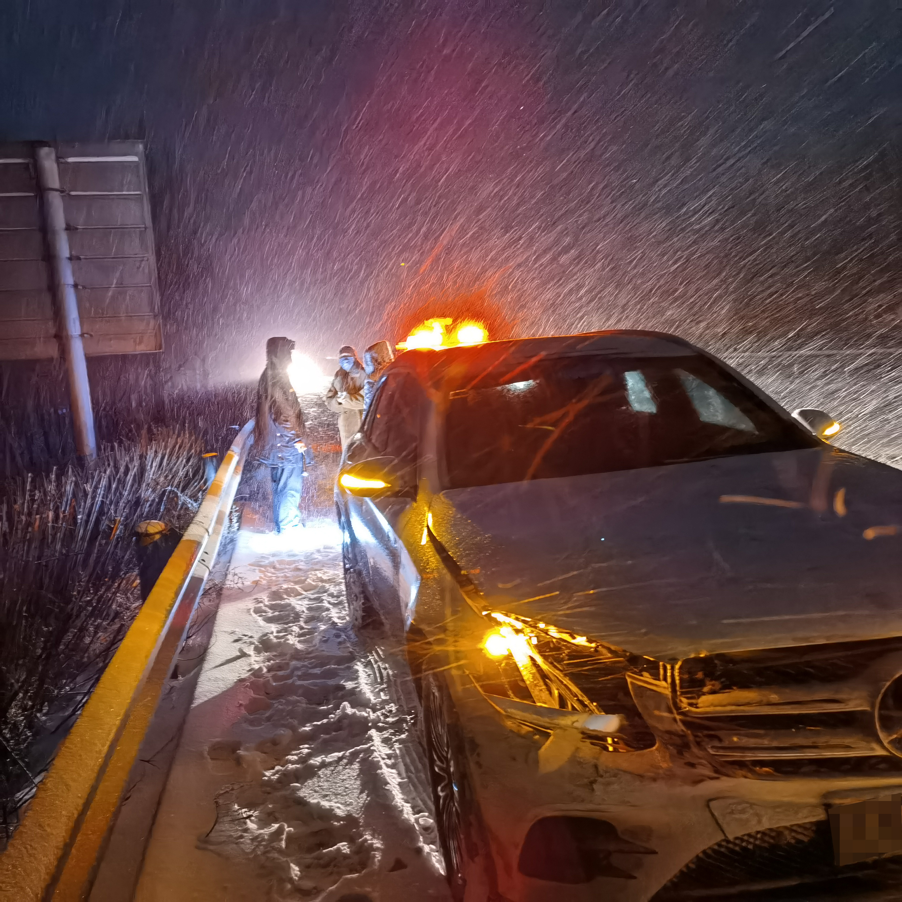 2月13日22时5分,乐亭大队执法人员魏国彬、肖穆鑫正在协助乐亭养护工区进行除雪作业,当行驶至沿海高速秦皇岛方向k100+900处时,发现一辆小轿车发生单方事故,停留在左侧行车道内,有两名中年人和一个冻的瑟瑟发抖的孩子站在车辆前方不停的东张西望,当时正下着大雪,地面非常湿滑,不时有车辆在此通过,一有不慎就会发生二次事故,现场情况非常危险。执法人员见状,在询问当事人没有伤亡情形后,立即摆放安全警示标志,示意车辆减速缓慢行驶,迅速通知救援公司,并将当事人让进执法车辆上进行防寒取暖。在22时13分,救援公司到达现场后,执法人员协助救援人员快速处理事故车辆,仔细勘验核对路产损失,在22时19分,事故现场处理完毕,执法人员将当事人转移至救援车辆上后,继续配合养护工区进行除雪保畅。