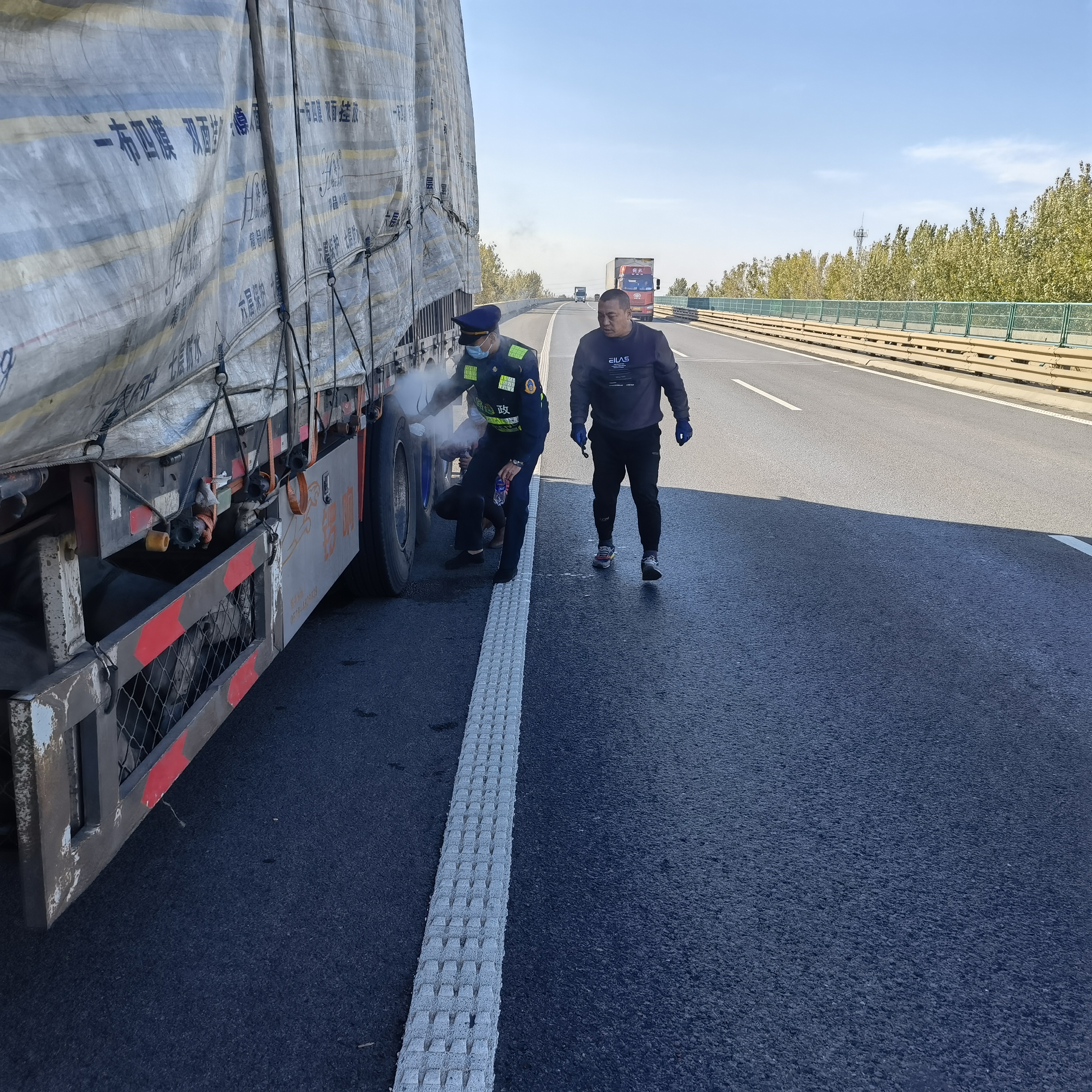 当天上午9时40分,乐亭大队执法人员孙行、肖穆鑫巡查至沿海高速秦皇岛方向k75+750处时,发现一辆大型半挂货车停靠在应急车道内,左后轮胎不停的冒出黑烟,有两名青年男子手持撬棍和水桶站在冒烟轮胎附近进行敲打和洒水,洒到轮胎上的水瞬间变成白色水蒸气冒出。执法人员判断该车辆可能要起火,于是立即停车,迅速从车上取下灭火器,对冒烟轮胎进行喷洒,防止了车辆自燃。执法人员在做好疫情防控措施后,询问当事人得知,该车辆行驶到此处时,左后轮胎的内胎突然发生爆裂,在踩刹车制动过程中,左后轮胎的外胎冒出了浓烟。由于车上装载的是冰箱、洗衣机、电视等家用电器,一旦车辆起火,这些家电将会被全部焚毁,后果不堪设想。正在万分焦急的时刻,幸亏有路政人员及时赶到,将即将着火的轮胎处理好,挽回了价值达四五十万的经济损失。当事人一边讲述事件经过,一边从从车上取出两条香烟,送给执法人员表示感谢,被执法人员当场谢绝。随后执法人员同当事人一起对冒烟轮胎再次进行了检查,确保安全后,提醒让其低速慢行到就近服务区将爆裂的轮胎进行更换。