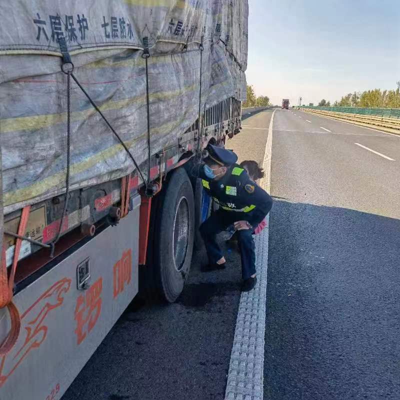 11月3日,乐亭大队执法人员孙行、肖穆鑫在沿海高速秦皇岛方向k75+750处救助轮胎冒烟的故障车辆。