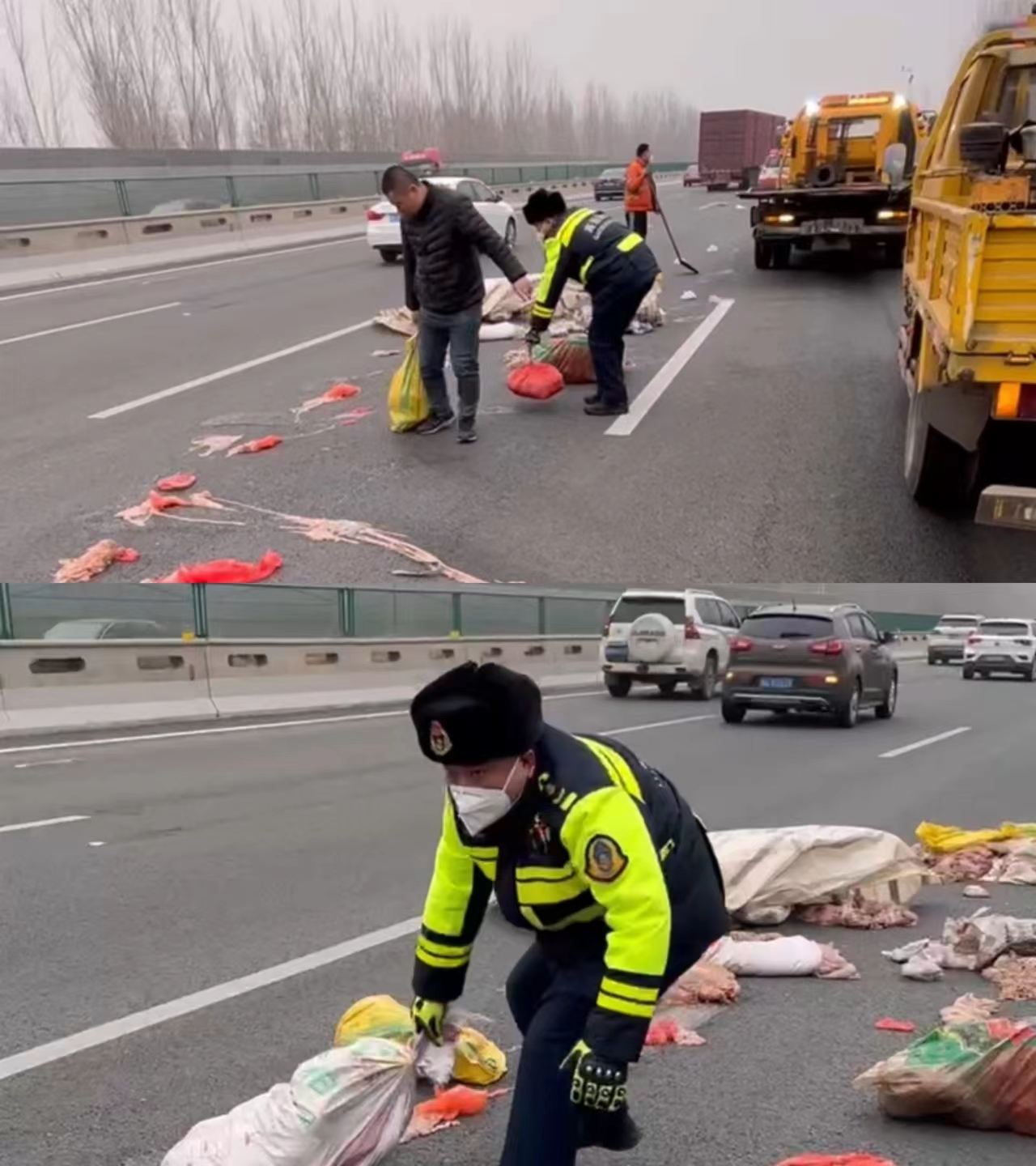 1月13日14时50分,京石支队石家庄大队四中队外业人员巡查至京港澳高速K223+100处,发现一辆皮卡车发生侧翻,车载的肉制品散落在沿途一百米的路面上。此时途经此处车流量大,极易发生次生事故。外业人员果断摆放警示标志,开启车载示警灯,一名外业人员指挥车辆有序通行;另外两名外业人员在救援和养护人员未到时,不怕脏与累,争分夺秒地开始和司机清理散落在行车道上的袋装肉制品。随后外业人员对事故现场进行勘验,确定无路产损失。在路政、交警、救援和养护人员的联合处置下,半个小时后事故车辆拖离现场,道路恢复畅通。