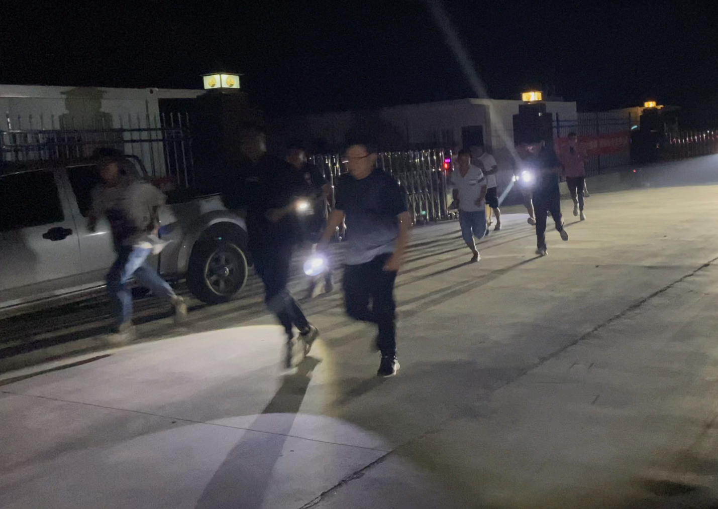 演练模拟项目所在地区突发暴雨造成电力断、通讯断、道路断“三断”情况组织开展。晚8时30分,急促的警报声笃然传来,所有参演人员听令而动,在项目管理人员的统一指挥调度下,井然有序撤离宿舍区。撤离过程中,大家采用手拉手小步快跑的行进方式,按照既定路线快速分流,前往空旷安全区集合等候。在各小组的通力配合下,用时3分钟圆满完成所有人员的疏散工作。