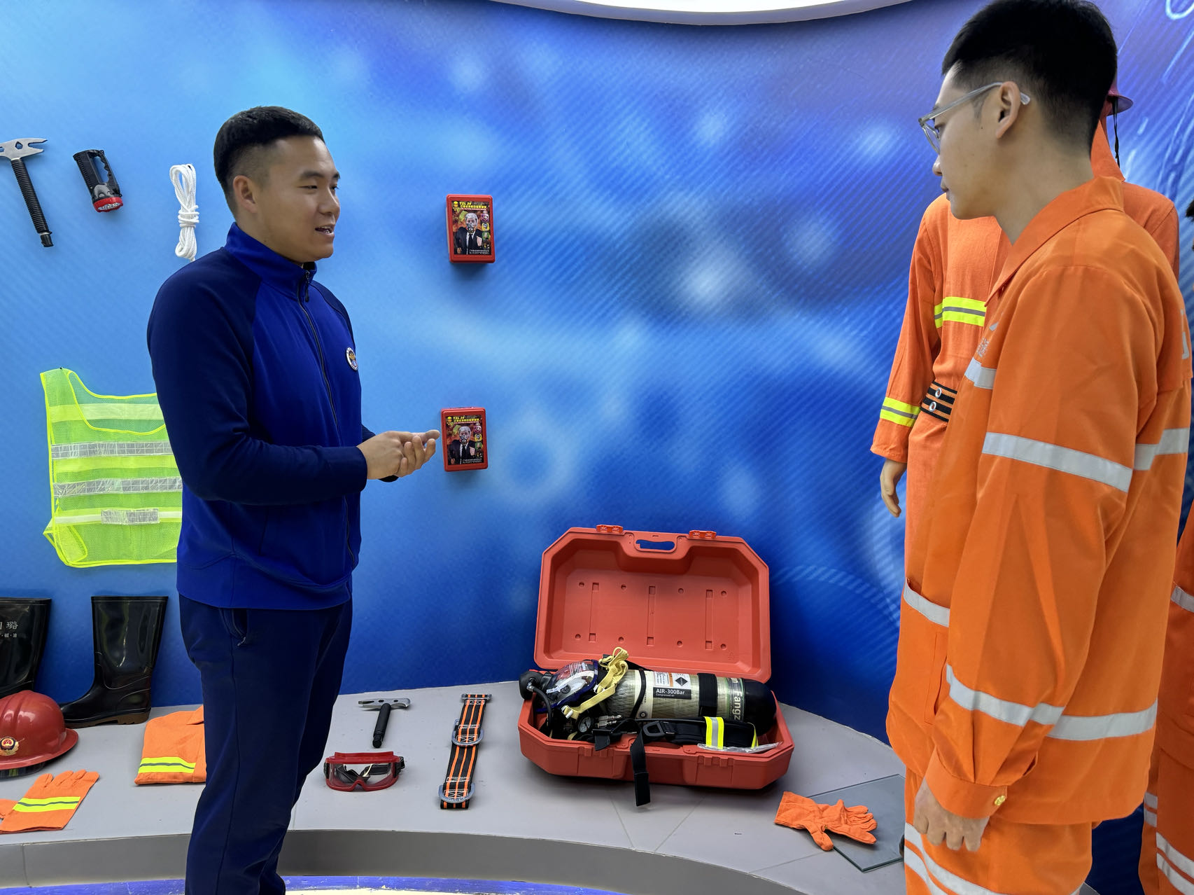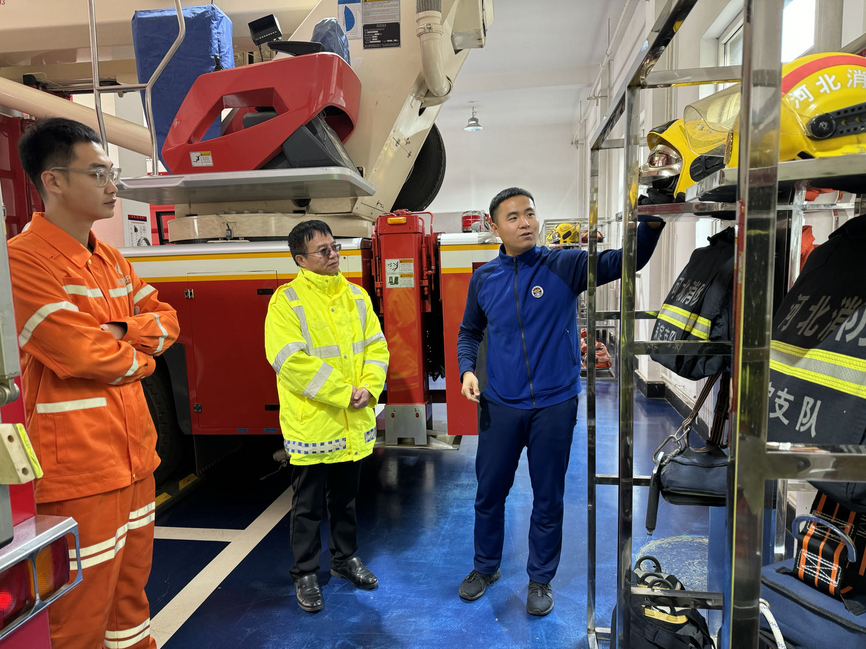首先,保定市白沟新城消防救援大队消防员向养护人员介绍并展示了抢险救援消防车、城市主站消防车和举高喷射消防车、灭火防护服、空气呼吸器、切割机以及其他消防器材装备。并对各种灭火器的构造、属性、适用范围进行了演示。