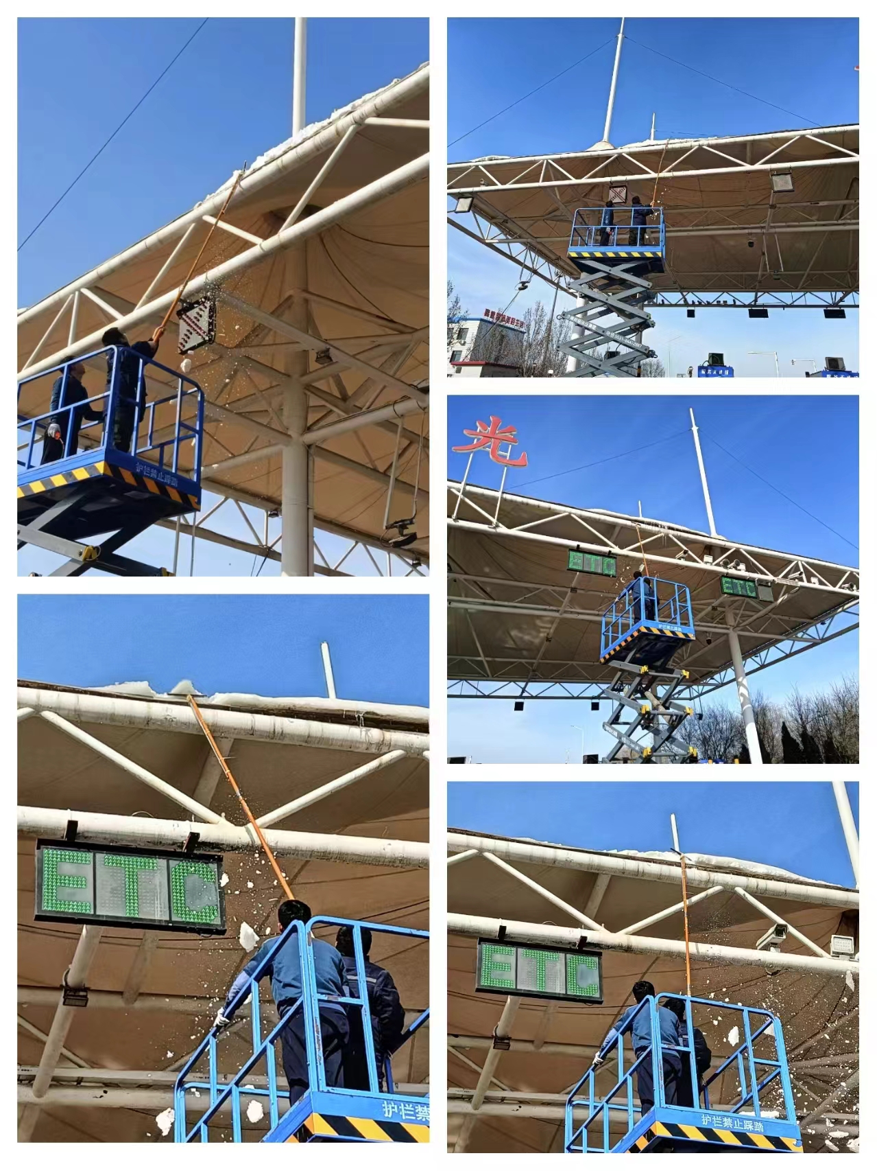 在清理过程中,工作人员利用升降梯和自制工具,将积雪和冰凌一点点地清除掉,确保了收费大棚的整洁和安全。经过大家半天时间的共同努力,积雪和冰凌被清理得干干净净,为过往司乘人员提供了安全畅通的通道。