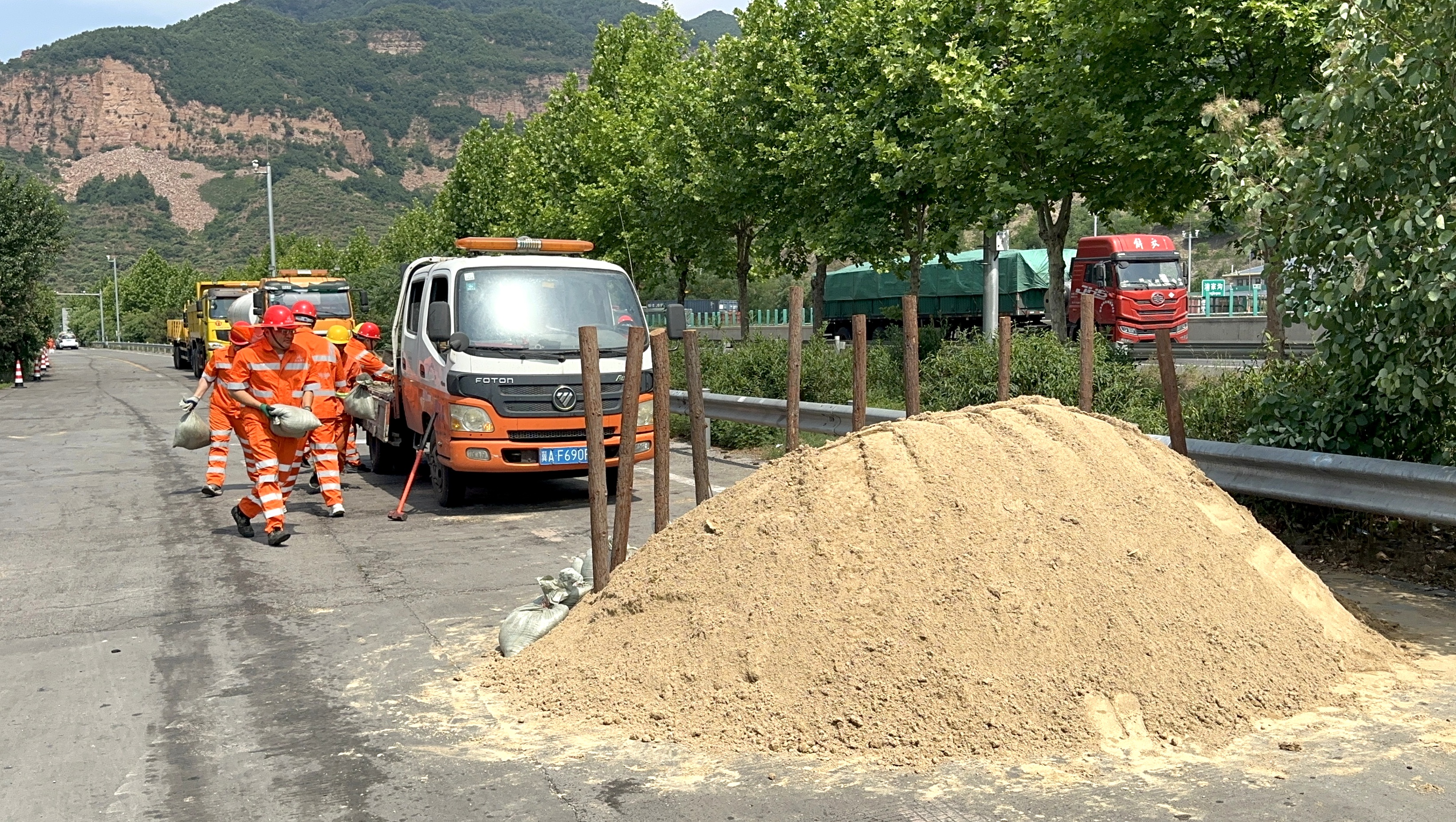 本次演练模拟下行清家沟服务区贯通车道处因强降雨导致上边坡滑坡坍塌,碎石泥土流落到行车道和应急车道上,阻碍交通正常运行。接到汛情后,龙泉寺养护队上报邢台分中心,接到启动防汛抢险应急预案通知后,迅速组织抢险队员调集车辆、物资、设备赶往现场,展开抢险处置工作。演练现场,所有抢险队员听从指挥指令、分工有序、密切配合,各环节衔接紧密,应急反应快速到位,出色地完成了抢险任务,真实地模拟了汛期险情应急处置的全过程,有效地检验了防汛应急预案的可行性和可操作性。