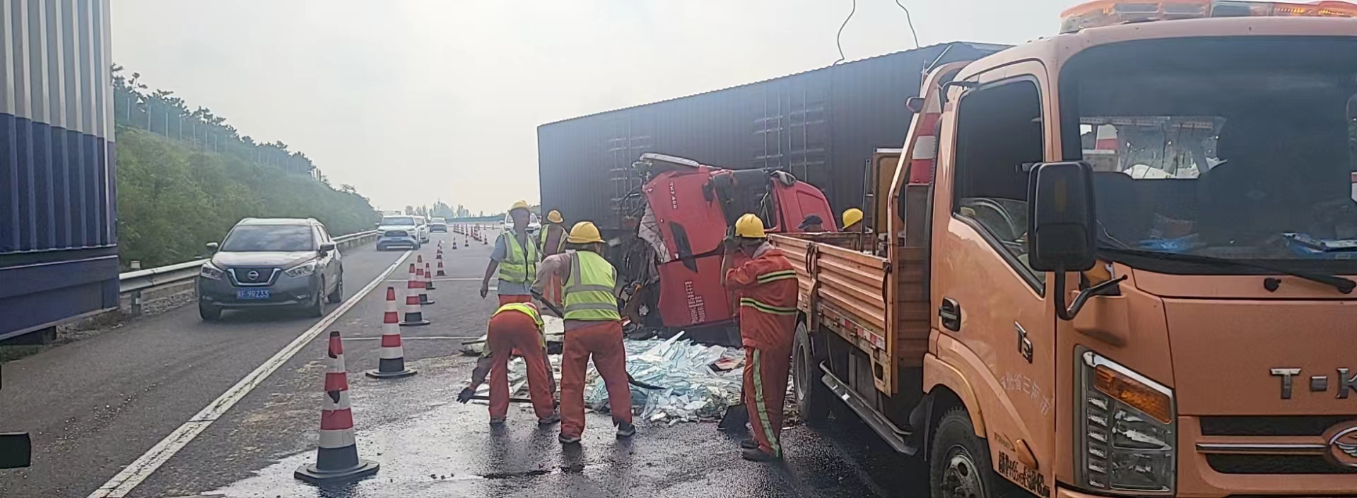 在第一起事故现场,多辆车辆发生严重碰撞,道路一片狼藉,车辆残骸、散落的货物和破碎的零部件铺满了路面。田强到达现场后迅速设置安全警示标志,疏导交通,防止二次事故的发生;同时通知后勤保障人员操作机械设备,迅速清理现场障碍物和杂物。而在另一处事故地点,情况同样不容乐观。一辆大型货车发生侧翻,货物倾泻而出,占据了大半幅路面。燕郊养护队携手高速交警、高速路政、保通保畅大队的同志们不畏艰难,齐心协力,先用吊车将货车扶正,再将货物逐一搬运清理,以最快的速度恢复道路的正常通行。