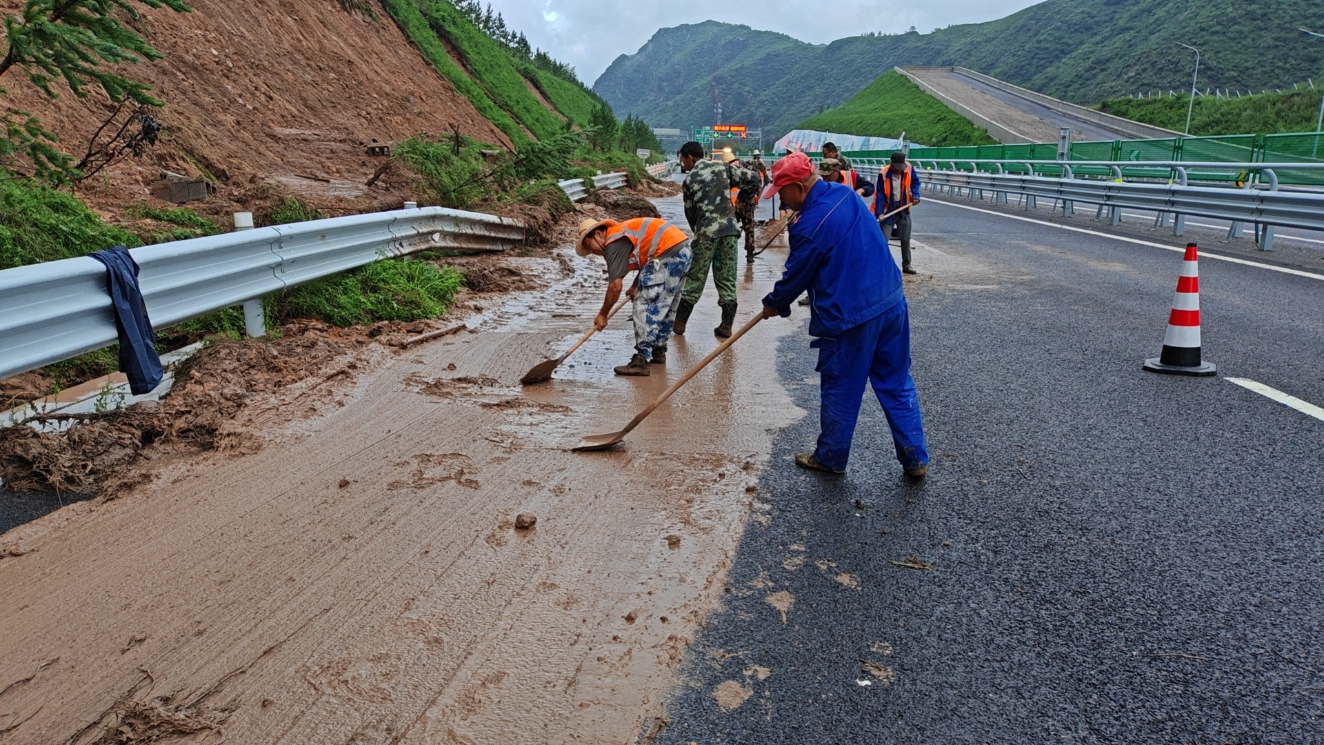 8月4日晚,延崇高速北京方向K169处,发生山体滑坡,泥沙已经冲至行车道,严重影响高速车辆行车安全。情况紧急,延崇养护队立即启动防汛应急预案,干部职工立即奔赴塌方现场迅速完成作业区布设后马不停蹄展开滑坡清理工作。