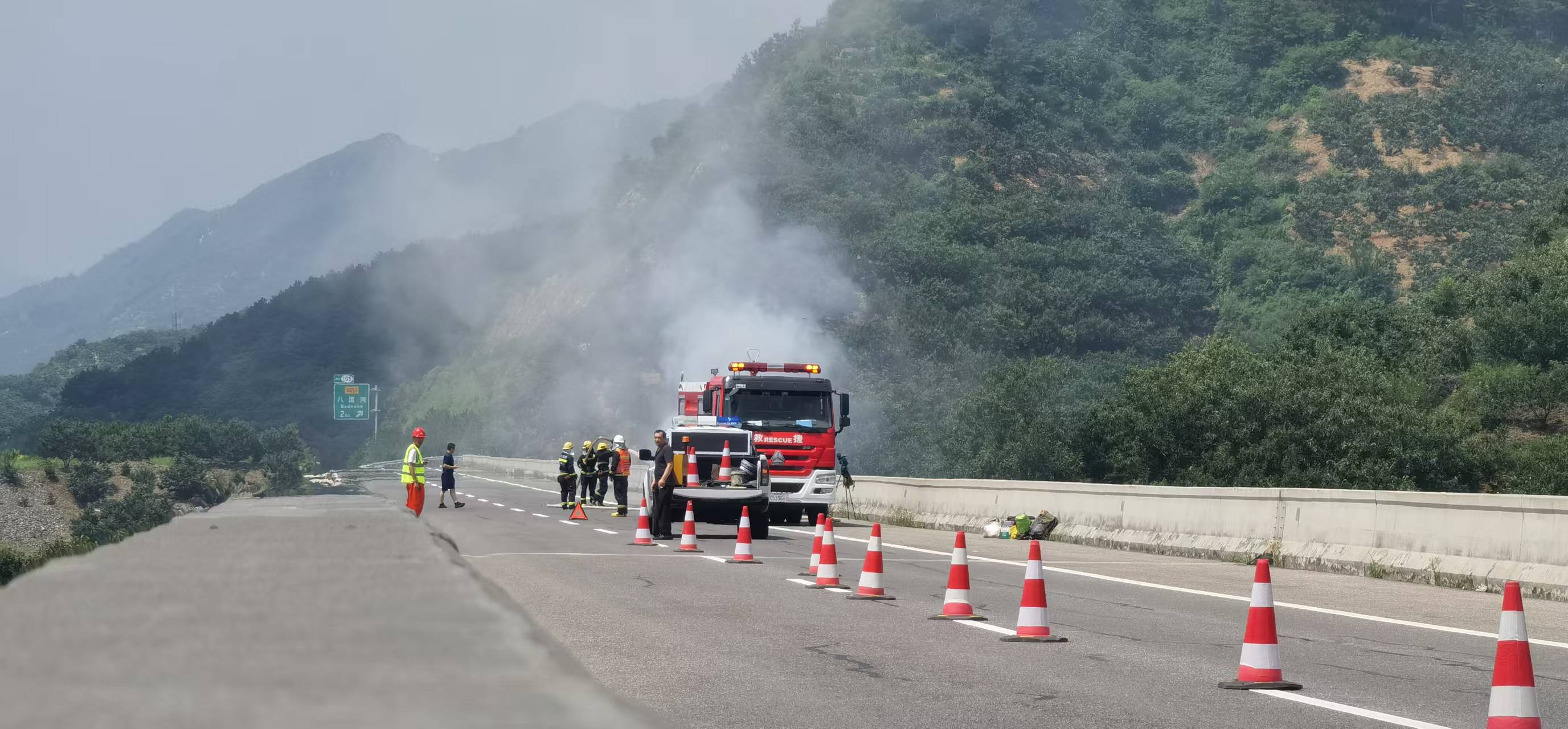 通过对事故位置的分析研判,车辆自燃事故现场距八道河收费站仅2千米。如果消防车正常U转到达事故现场至少需要40分钟的时间,根据此情况经请示高速交警,由就近的指调中心外业中队在八道河收费站等待消防车,待消防车到达收费站后用巡逻车带车逆行上道。11时46分救援队伍到达现场,立即开展协同作战扑救火灾,11时56分明火被扑灭,12时26分现场施救完毕,道路恢复正常通行。