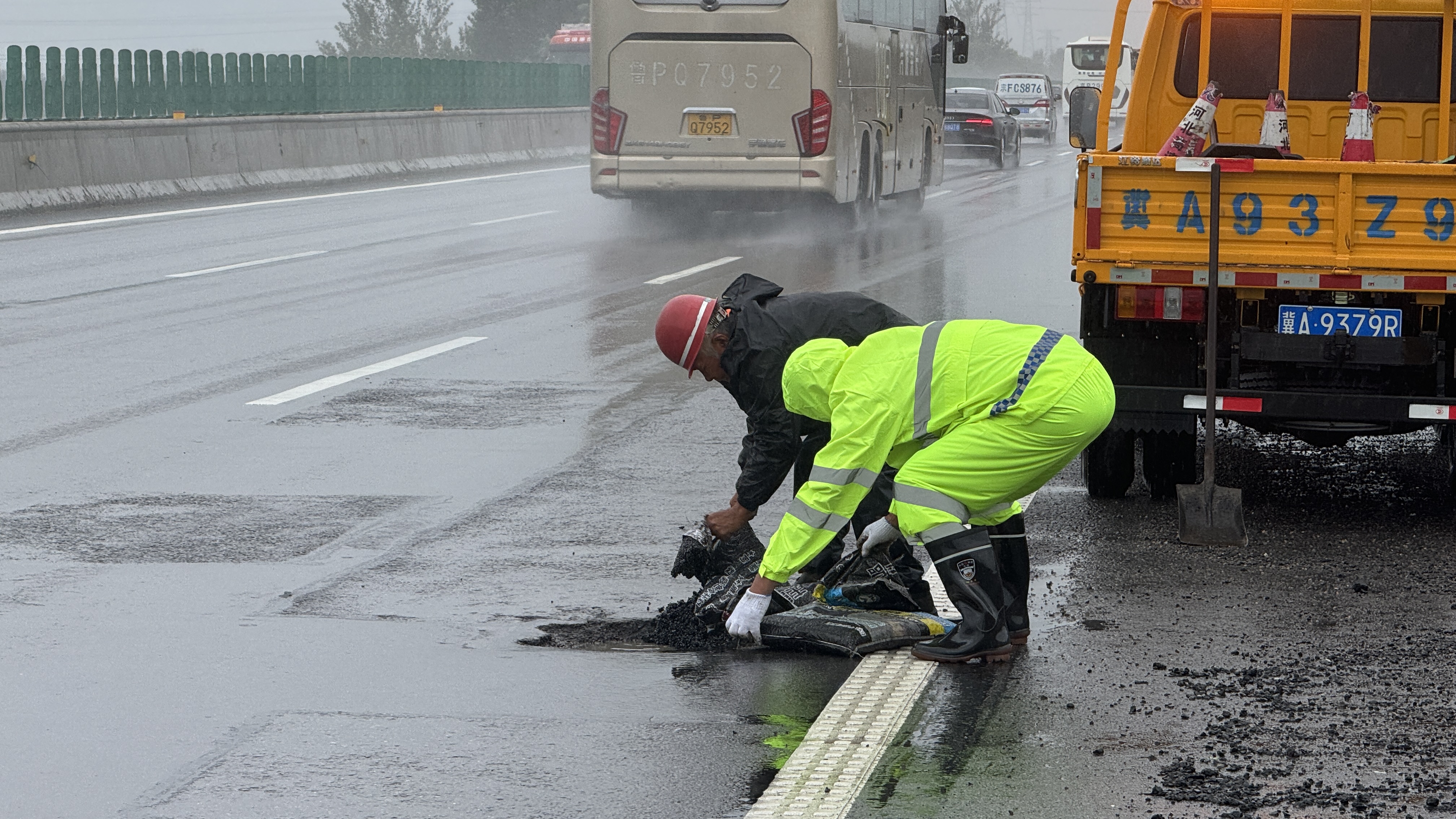 8月26日傍晚,衡水分中心饶阳养护队养护辖段突降暴雨。接养护班组通知,大广高速滹沱河特大桥和幸福渠大桥桥面等位置因降雨出现坑槽需紧急处置。