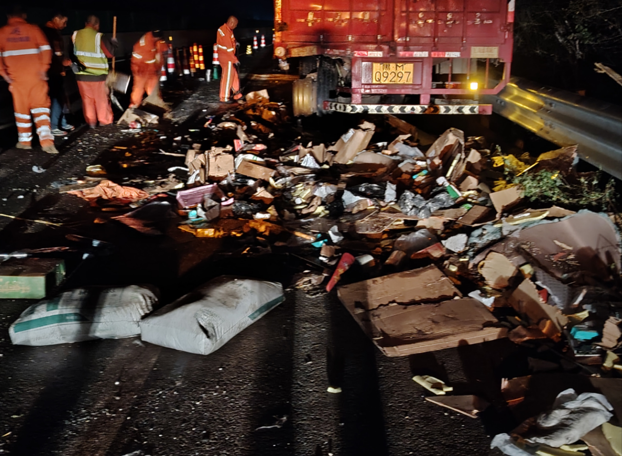 事故现场,一辆运送快递的大型半挂车与暂停在应急车道等待救援的车辆发生追尾。一车快递及部分车辆破损残片散落一地,情况复杂。七家养护队人员凭借丰富的经验和专业的技能,迅速对现场进行评估,并制定出高效的清理方案。他们明确分工、各司其职:设置警示标志、移除障碍物、修复受损路面、引导过往车辆。在昏暗的车灯下,他们顶着初秋的冷风,忍受着身体的疲惫,始终坚守在岗位上。六名养护人员,两台车辆,经过整整五个小时不眠不休的连续奋战,凌晨四点事故现场终于被彻底清理完毕,道路又恢复了整洁畅通。