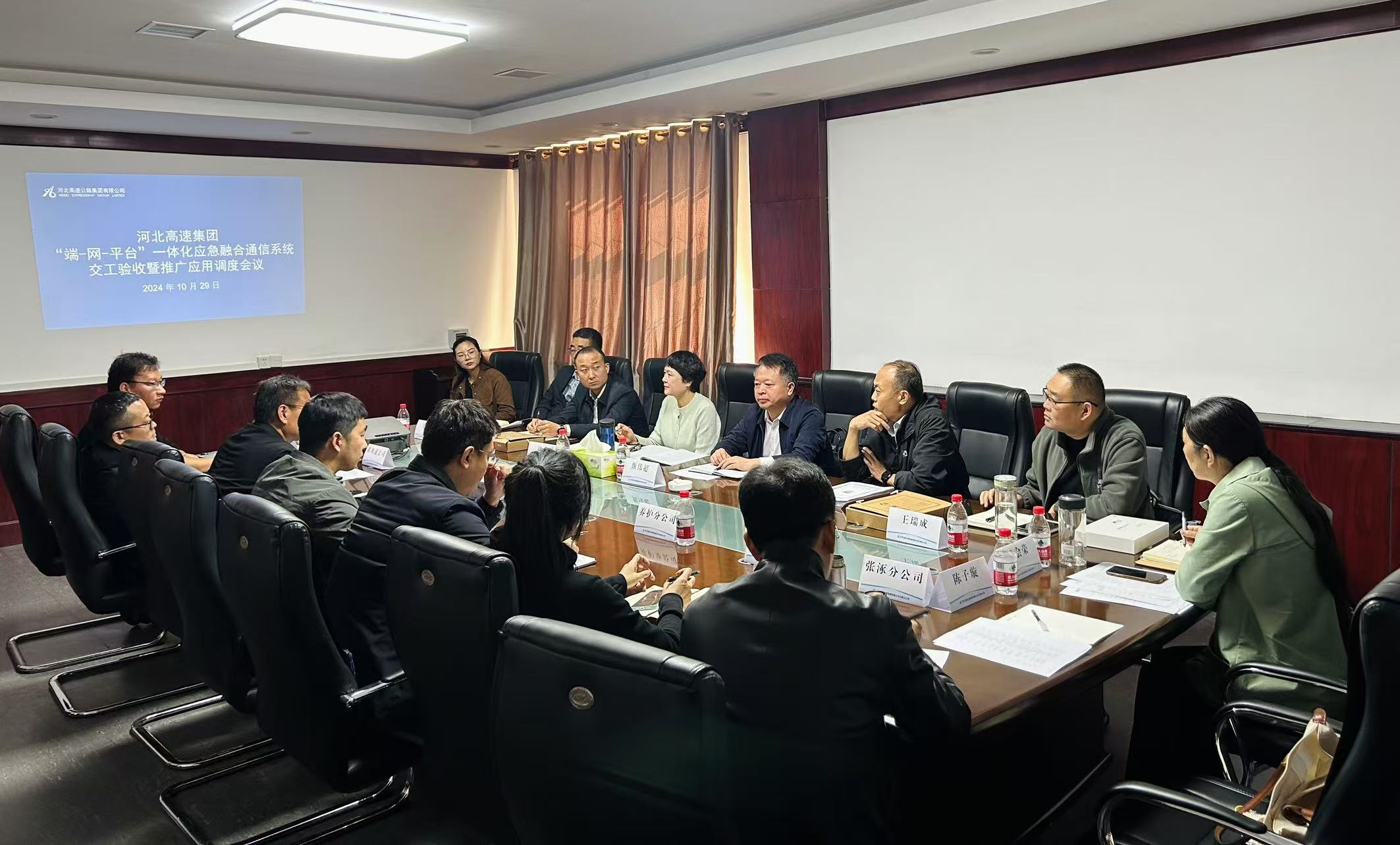 2024年10月29日,集团公司应急办在养护分公司藁城养护队组织召开“端-网-平台”一体化应急融合通信系统交工验收暨推广应用管理调度会。集团公司安全环保部部长甄伟超、副部长王瑞成,财务部副部长席伟、技术创新部副部长刘爽、办公室副主任陶涛,及指挥调度中心、承德分公司、张涿分公司、邢汾分公司、养护分公司、冀翔通公司、远东通信相关负责人员参加会议。