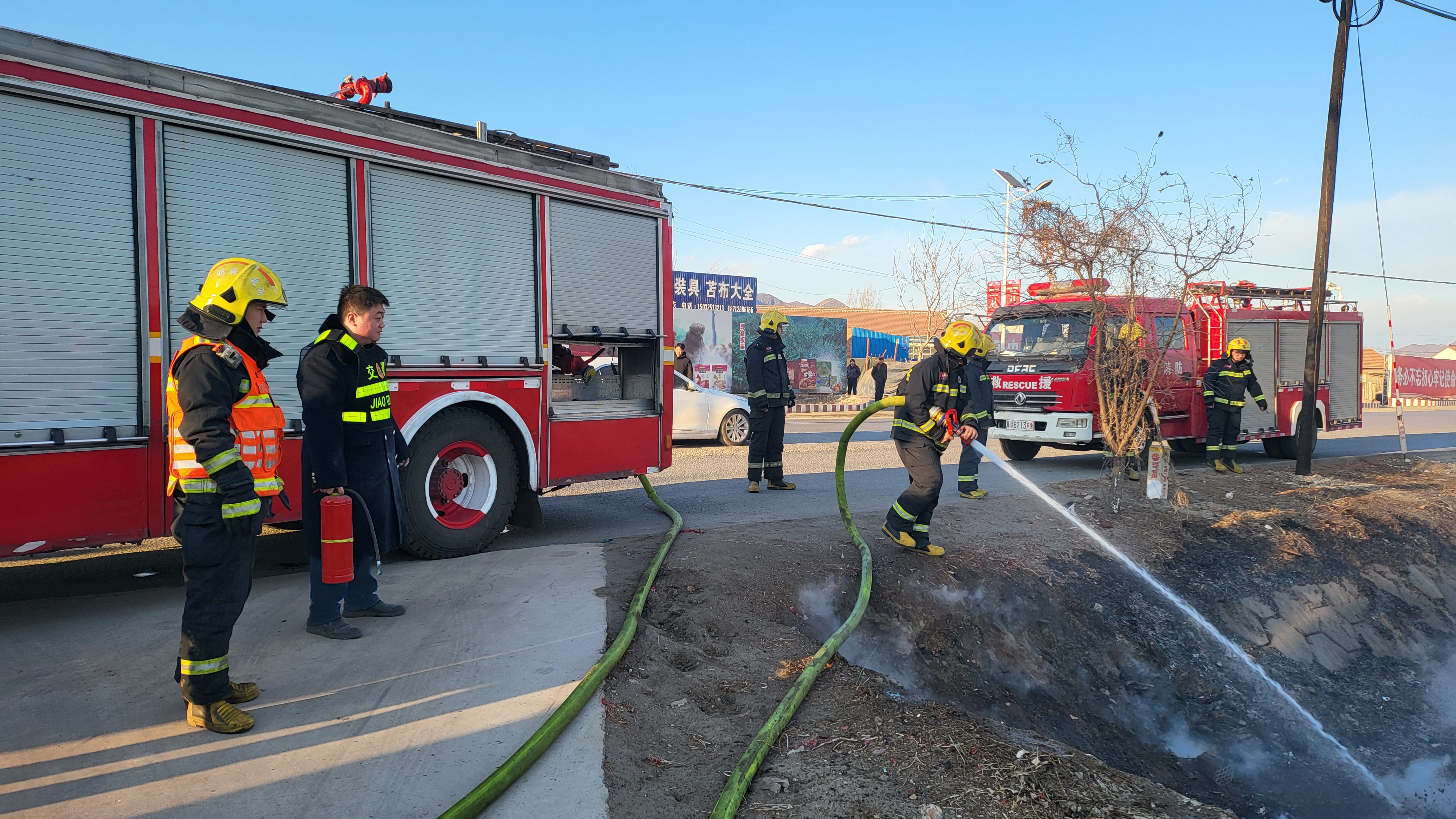 值班站长第一时间赶到现场,经过现场勘察,发现现场存在多处着火点,且边沟处有大量树木枯枝落叶,极易燃烧,加之当天河北气象局发布大风蓝色预警,风力较大,火借风势会迅速向收费站边沟周边蔓延,如果不及时扑灭,后果不堪设想。值班站长请求当地熟知地址的村民迅速拨打119以便火警能精准出警,随后立即与班长返回收费站拿取灭火器,在上报监控大厅协助监控火情的同时联系平安城综合执法队协助灭火。经多部门团结协作,共同努力下,火势得到及时控制,在火警赶到现场前就将火灾基本扑灭,未造成人员伤亡和财产损失。最后,值班站长与班长协助火警对现场余火进行清理,防止复燃。
