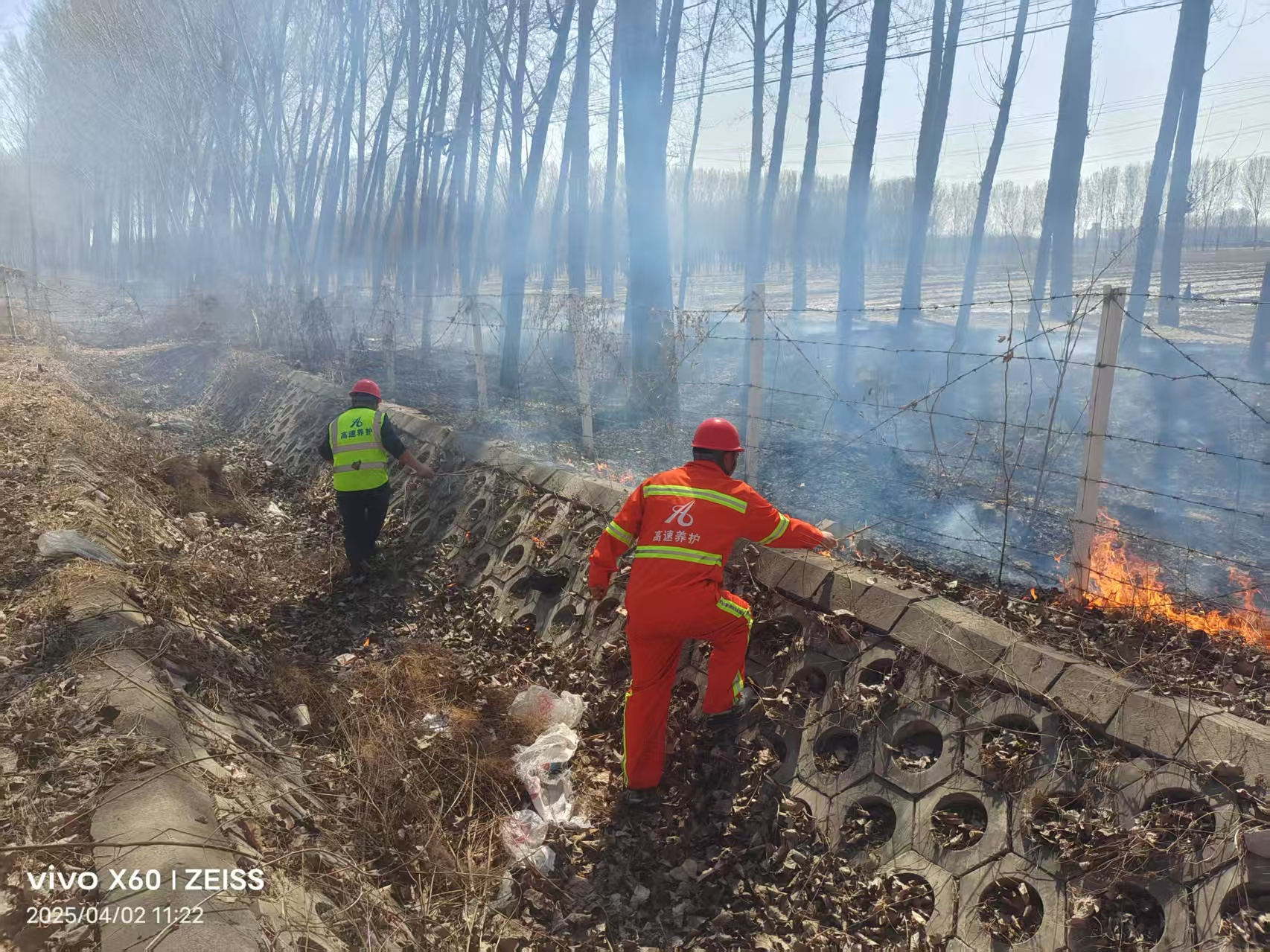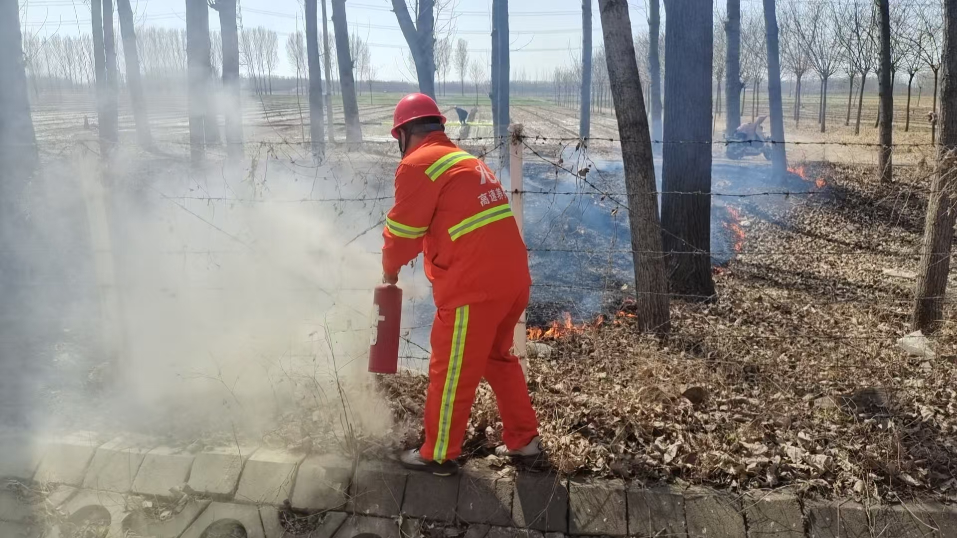 4月2日上午11点16分,在G0121京秦高速秦皇岛方向K107+300路面沉陷处治施工现场,现场安全员在施工过程中巡视发现高速右侧边沟有明火燃烧,烟雾弥漫,周边干燥的枯草正被火苗逐步吞噬,稍有不慎便可能导致火势扩大,容易引起边坡失火,危及过往车辆和司乘人员安全。